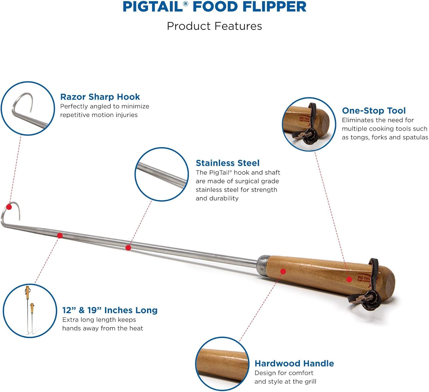 - PigTail Meat Flipper: The 19-inch and 12-inch PigTail Meat Flipper combo features a hardwood handle