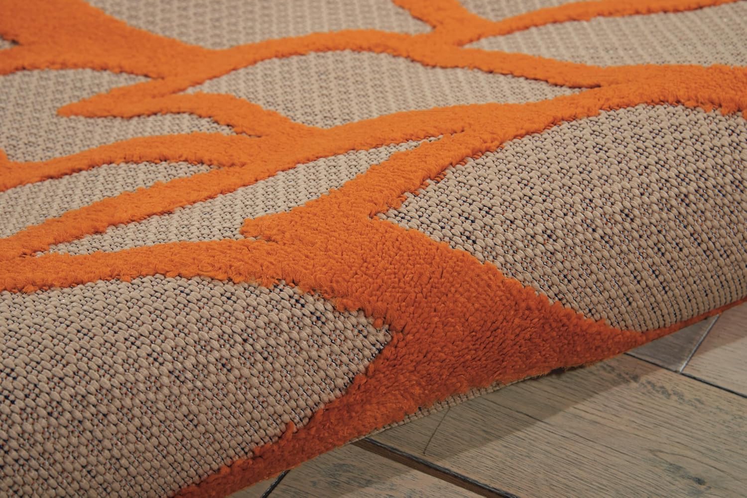 - This indoor and outdoor rug has solid and outlined lotus patterns in navy, blue, orange, and green