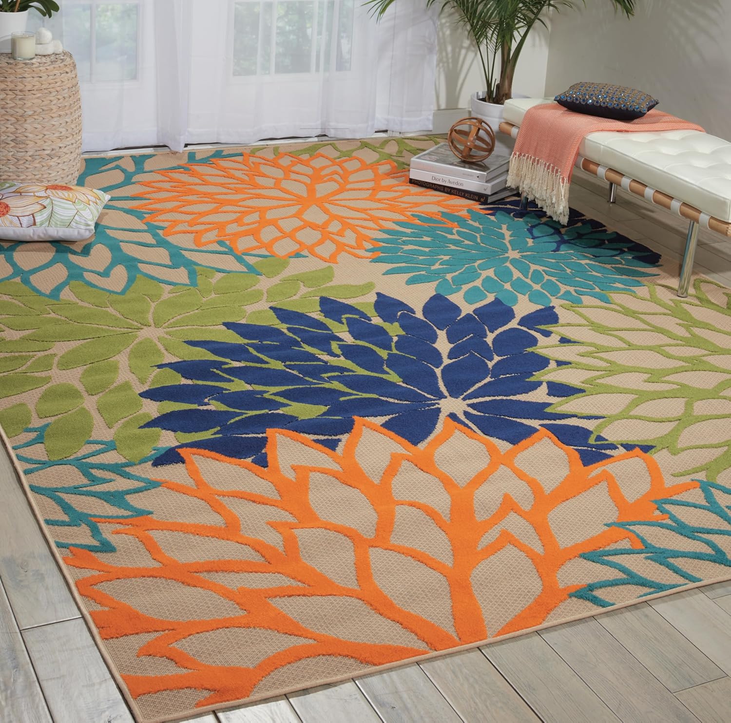 Nourison Aloha Indoor/Outdoor Multicolor 9'6" x 13' Area Rug, Tropical, Botanical, Easy Clean, Non Shedding, Bed Room, Living Room, Dining Room, Deck, Backyard, Patio (9x13)