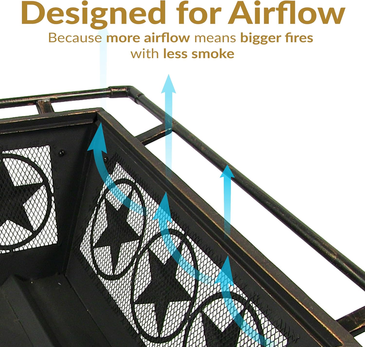 - ENHANCED AIRFLOW AND SAFETY: The mesh sides of the cooking fire pit with star cutouts and built-in wood grate improve air circulation, allowing wood to burn hotter and longer with less smoke. The included spark screen helps contain embers, while the poker allows for effortless fire control and log adjustment. The outer ring surrounding the pit adds an extra layer of security by ensuring a safe distance while tending to the fire.