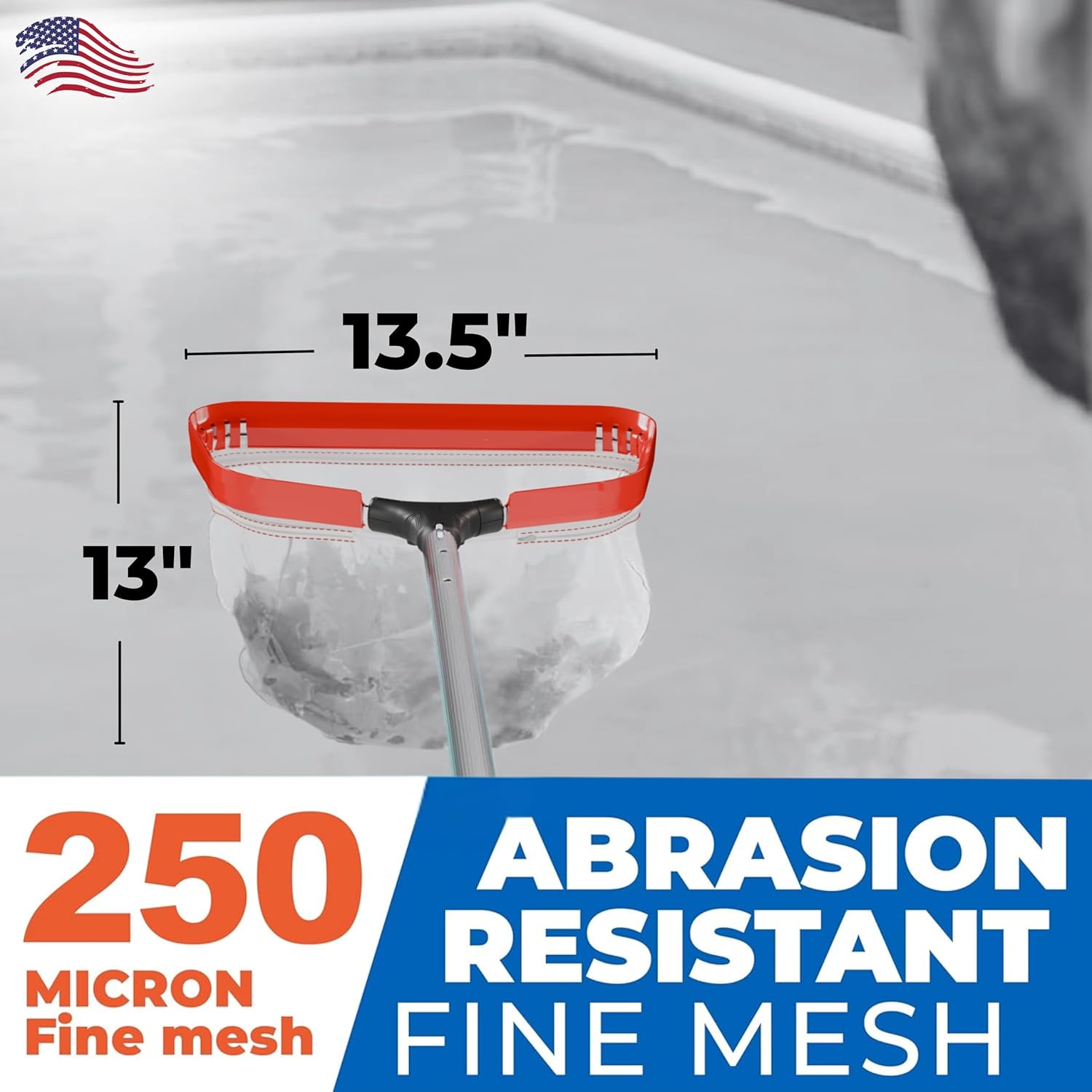 - WORK FASTER WITH "SMOOTH GLIDE" 250 MICRON MESH - The perfect "just right" combination of speed and filtration. Grab virtually all surface and sunken pool debris (including san, silt and pollen) from your client's pool without "pushing" all the water. Skim and rake quickly and efficiently, banking that time for more pools or more family time after a long day.