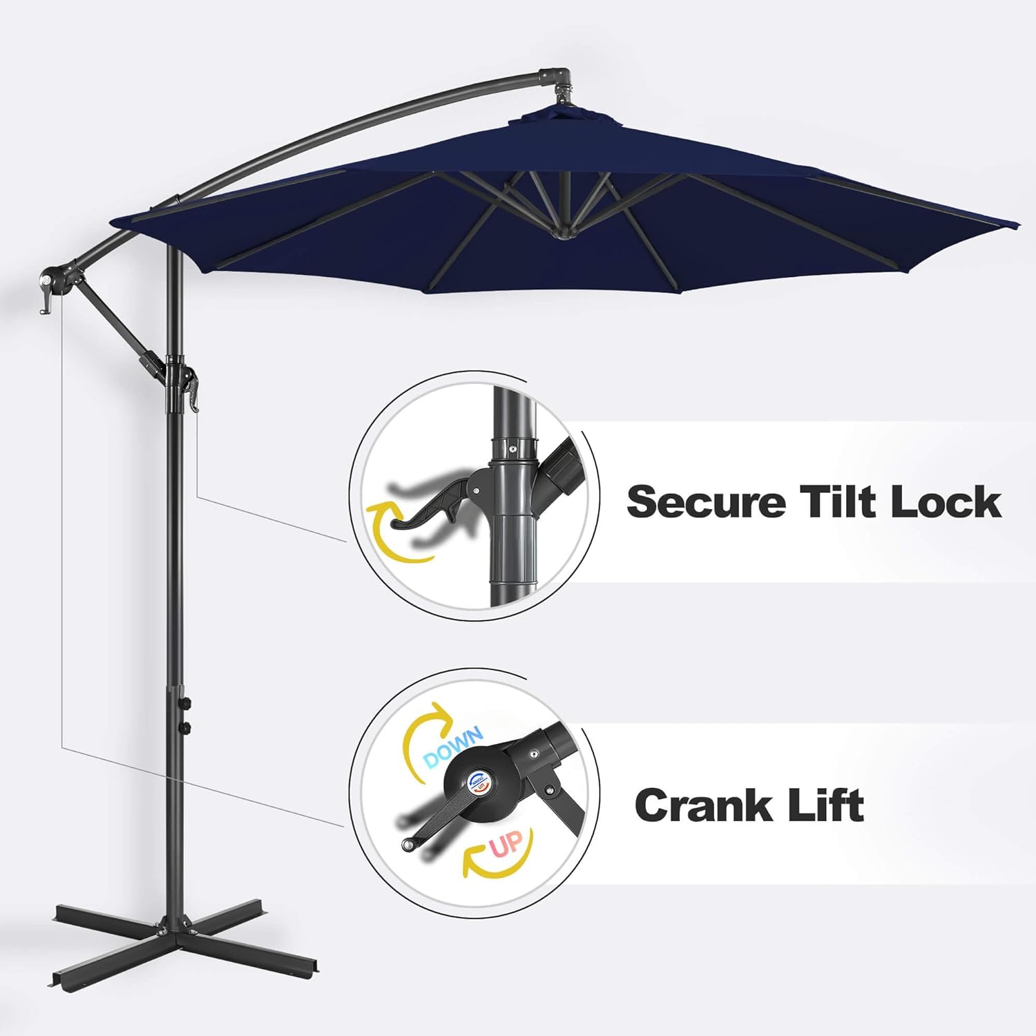 - Note: This cantilever patio umbrellas come with a lightweight cross base (stand only) and requires a minimum 100lbs (45kg) weighted base or sandbags for safe, stable use (compatible bases: B0795SD1JS, B0CKSG7M4W). Protect your investment from rain, snow, and wear with our durable weatherproof cover (B0DRYPXVDW) to double its lifespan—because luxury shade should last