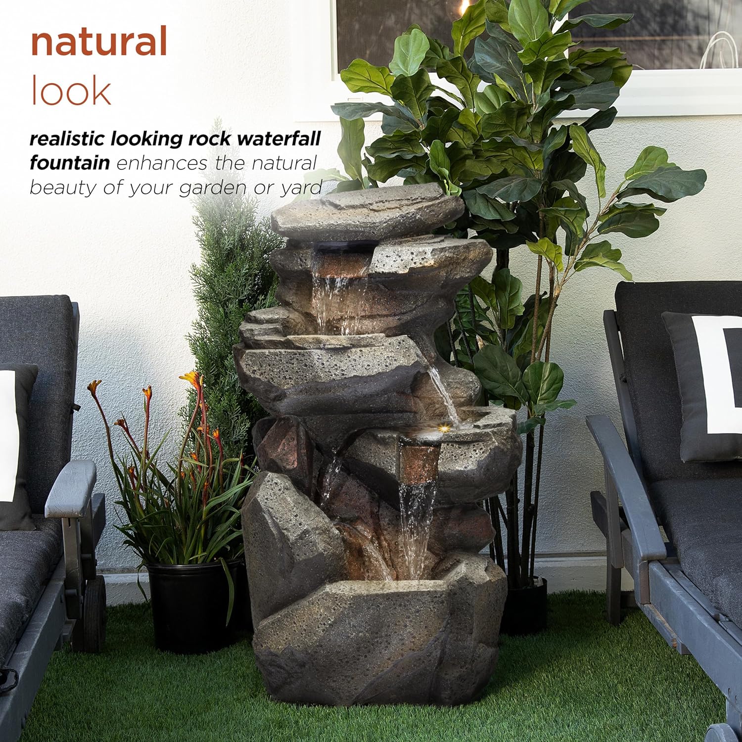 - ROCK DESIGN: Crafted with a natural stone appearance, this multitiered waterfall fountain blends seamlessly into gardens, patios, and outdoor spaces, creating a serene and nature-inspired focal point that enhances any outdoor décor with rustic charm.
