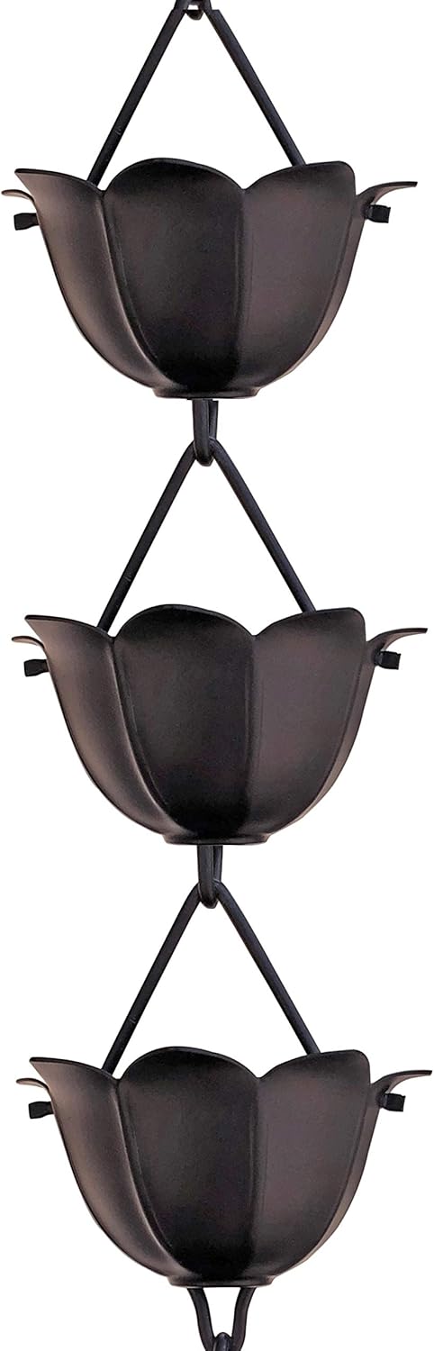 - ELEGANT & STYLISH APPEARANCE: The black lotus rain chain is a beautiful crafted with a wide flared mouth to efficiently capture most of the rainwater with slightly indented and defined petals. Crafted from premium rain chain aluminum, each cup showcases a unique lotus design. Modern matte black finish provides a simple, elegant, and contemporary look.