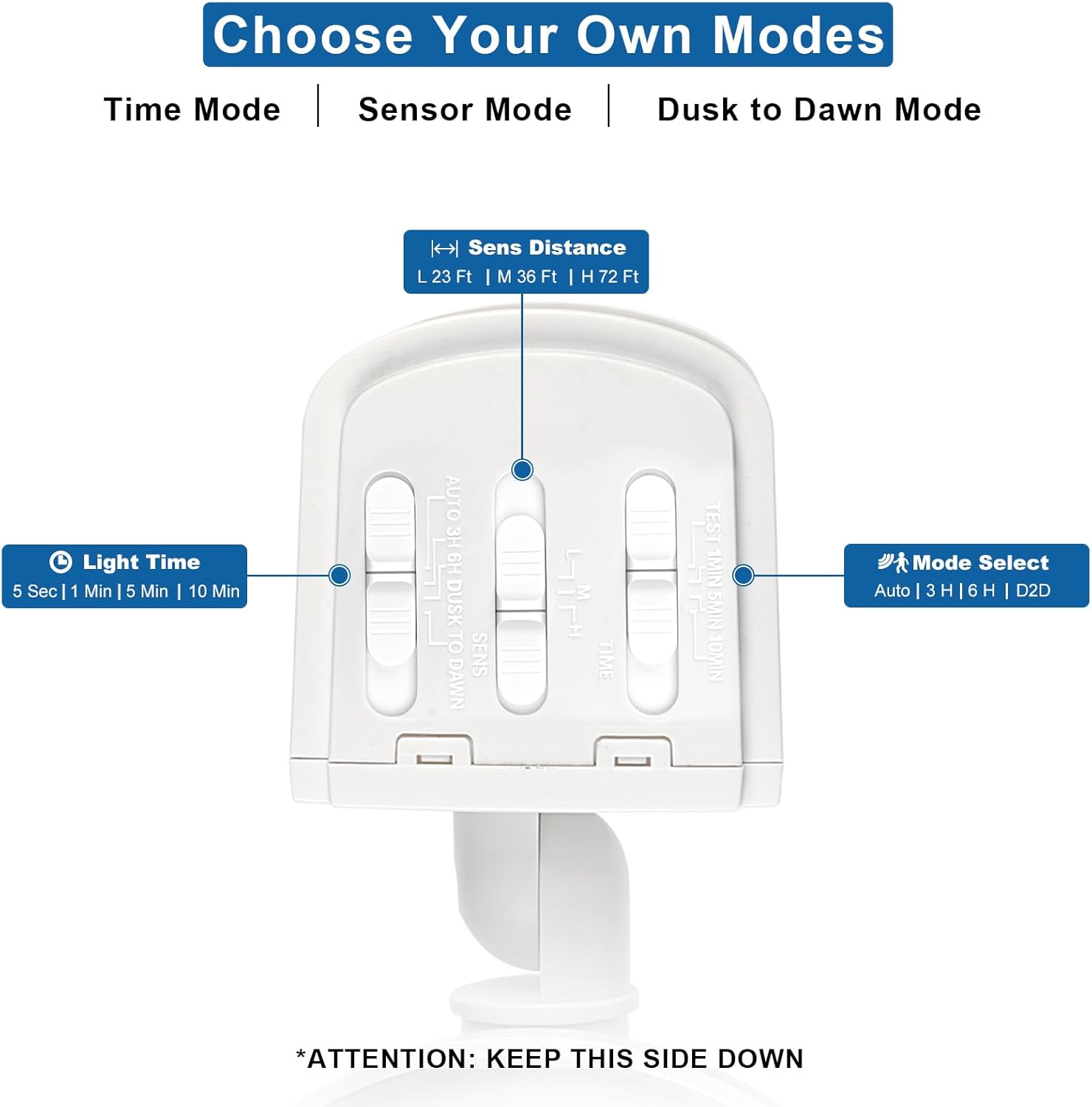- Photocell Light Sensor Mode - Dusk to Dawn Mode, at dusk, the light will turn on at 50% brightness as an accent light. When motion is detected the light illuminates at 100% brightness; 3H/6H Mode, at dusk, the light will turn on at 50% brightness as an accent light. When motion is detected the light illuminates at 100% brightness. The light will operate like this for 3/6 hours. After 3/6 hours the light becomes just a motion light.
