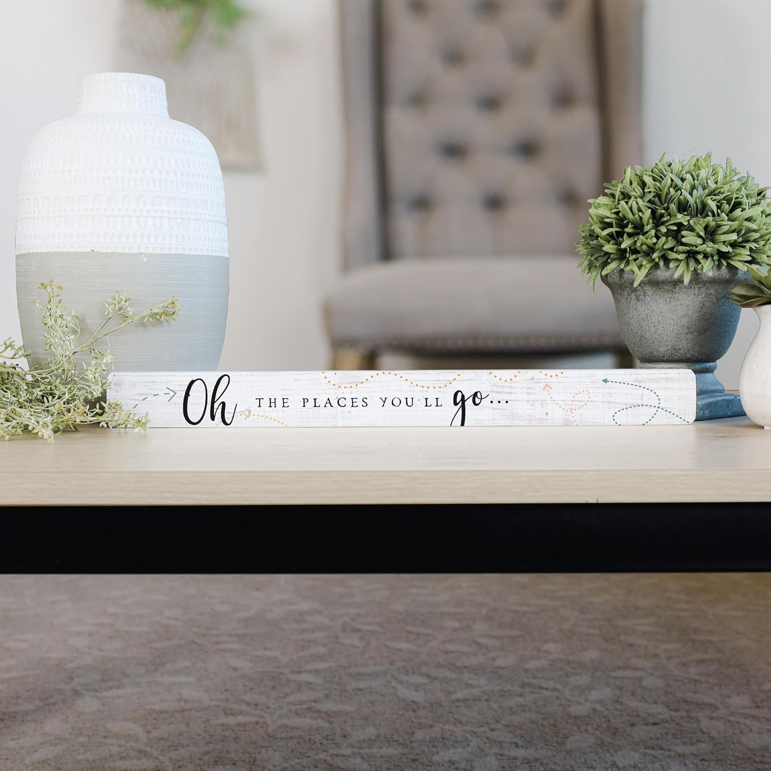- Wooden sign reads "Oh the places you'll go..."