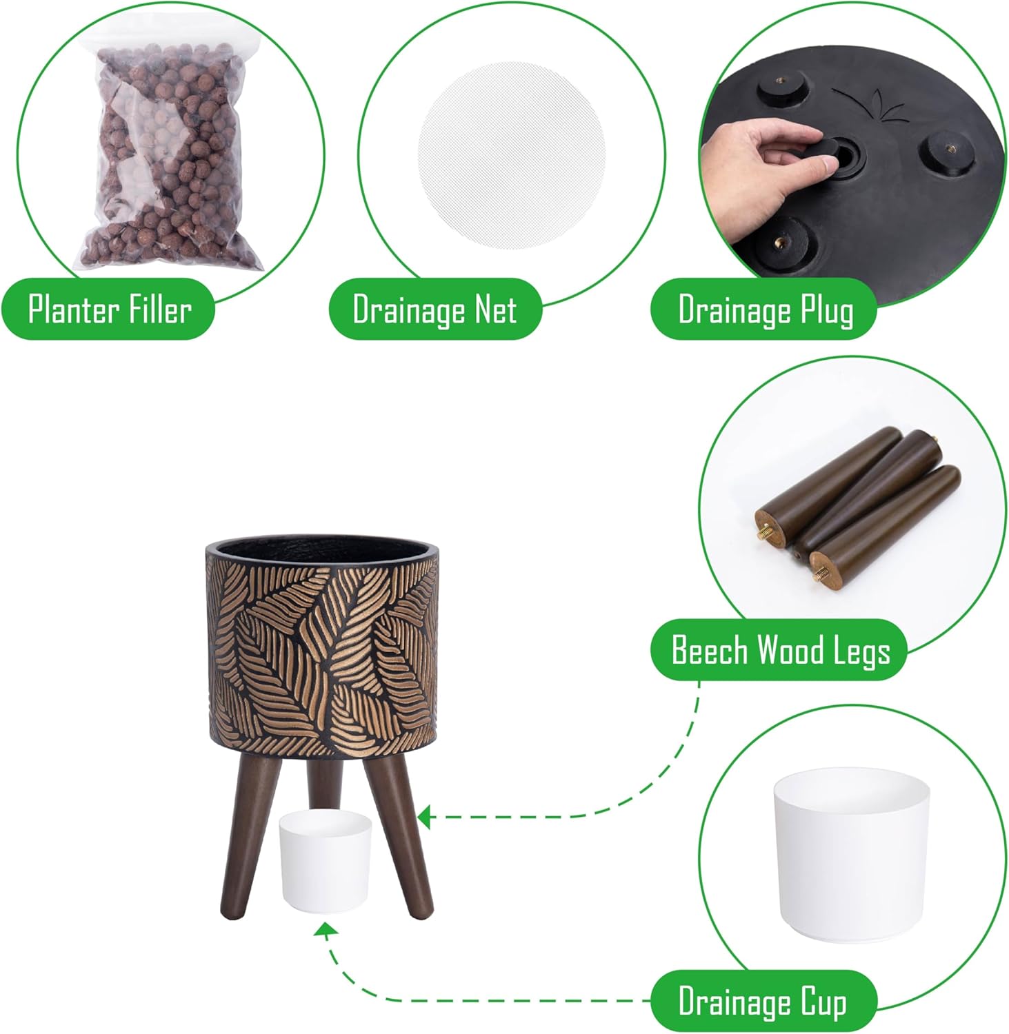 - Whatβs included: planter pot with drainage hole, drainage plug, set of stand β 3 solid wooden legs.