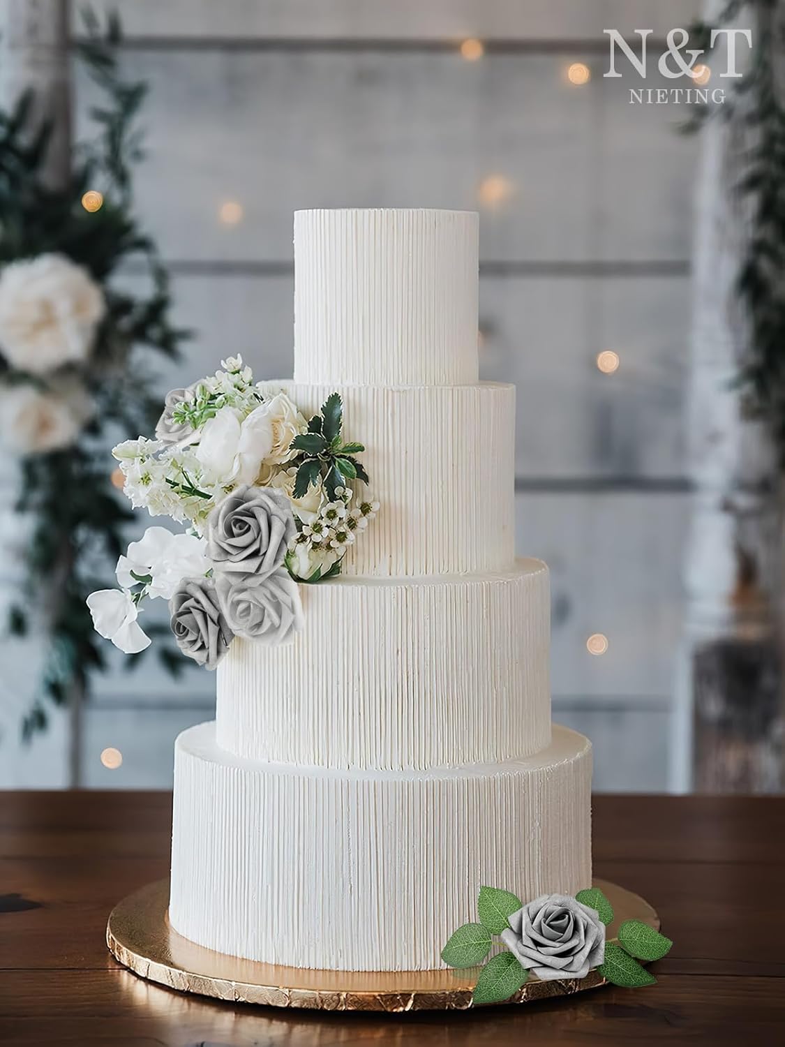 N&T NIETING Artificial Flowers, 25pcs Fake Flowers with Stems for Cake Decoration DIY Wedding Party Baby Shower Decoration, Silver White and Silver Grey