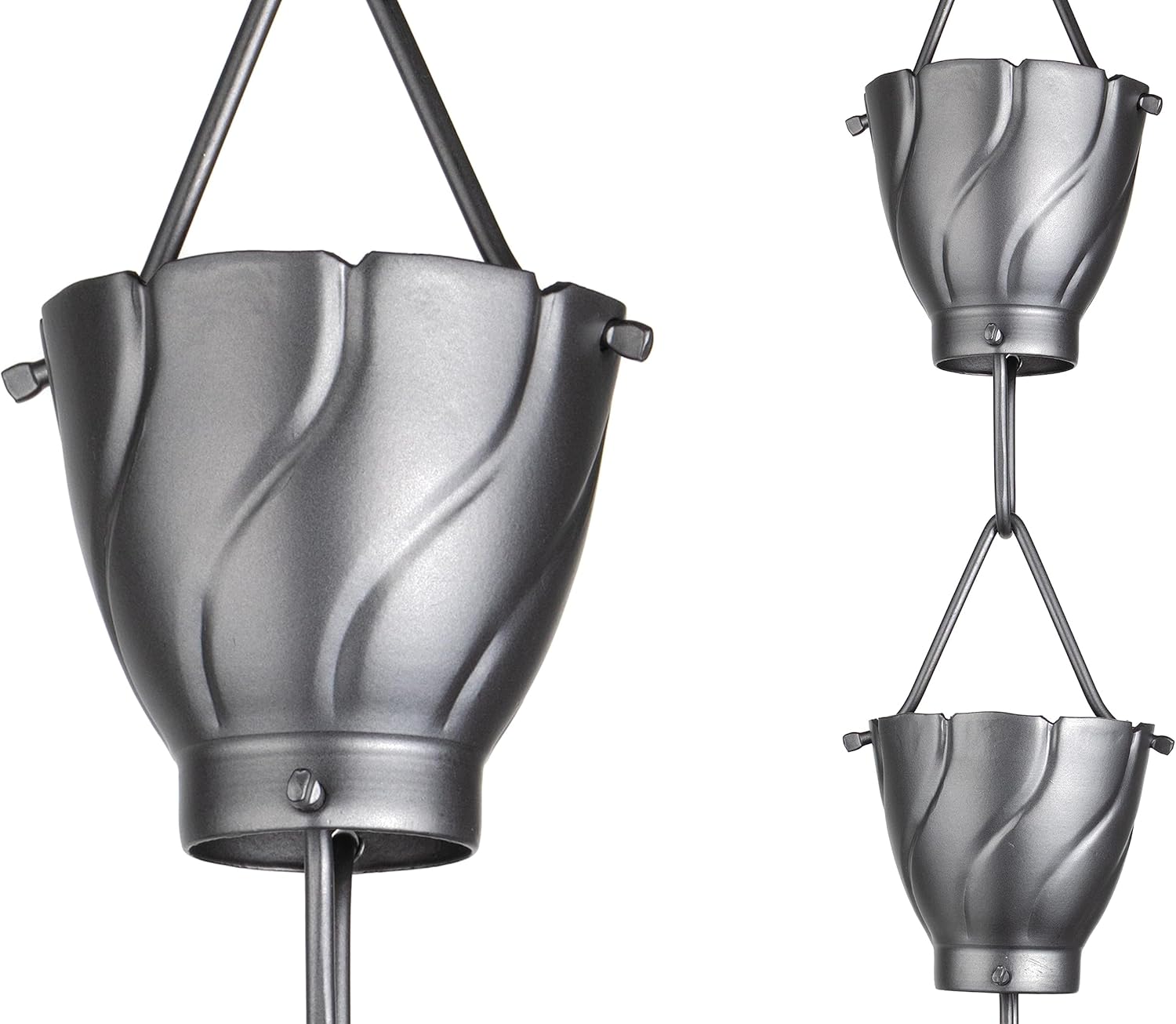 - ELEGANT & STYLISH APPEARANCE: Featuring a unique scalloped rim design, each cup of this aluminum rain chain for gutters adds visual interest while guiding rainwater smoothly. Crafted from premium rain chain aluminum, each cup showcases a unique scalloped rim design. Modern pewter finish provides a simple, elegant, and contemporary look.