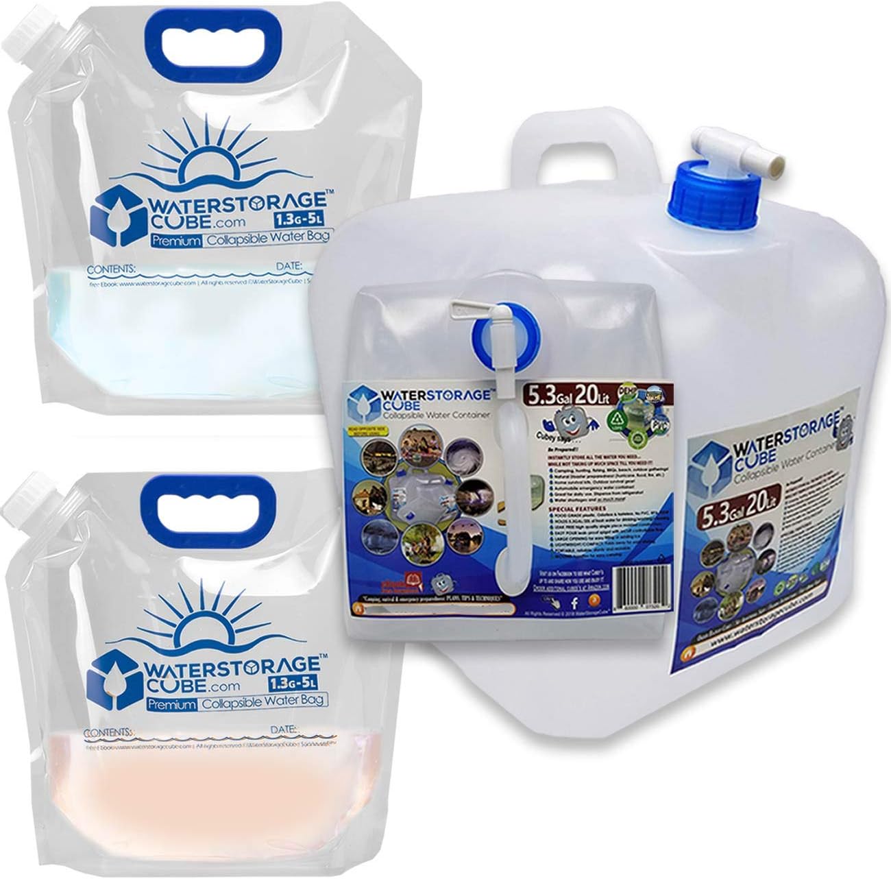 - COMBO BUNDLES include our 2 best selling types of space-saving premium water containers. Choose from combos that include BOTH flat-folding (5L) BAGS and collapsible CUBES with spigot (20L and/or 10L)