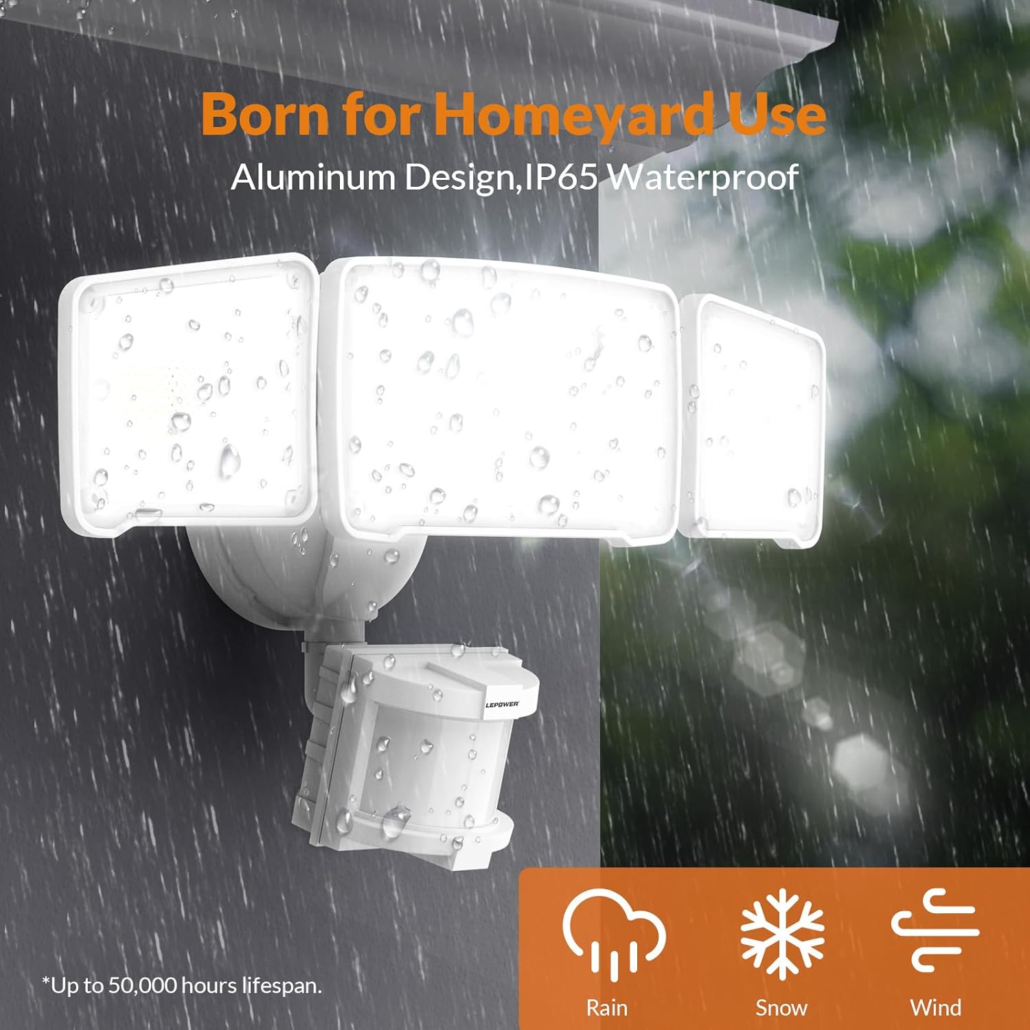 LEPOWER LED Security Lights Motion Sensor Light Outdoor, 38W 4200LM Light, 5500K, IP65 Waterproof, 3 Head Detected Flood Light for Garage, Yard, Porch (White)