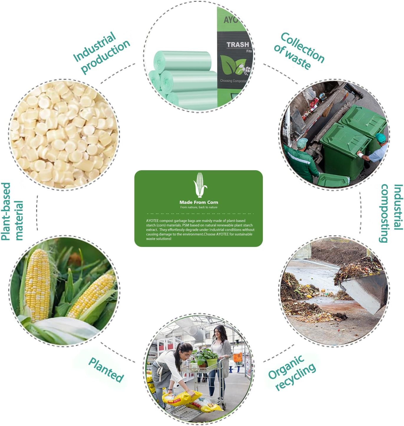 - Compost Trash Bags: The main materials for our small trash bags are made of Plastarch material(PSM), which is based on natural renewable plant starch extract. compostable, meets ASTM series standards. These small compost bags can be rapidly degraded in municipal industrial composting facilities (at 50-60Β°C constant humidity), to avoid harm to the environment