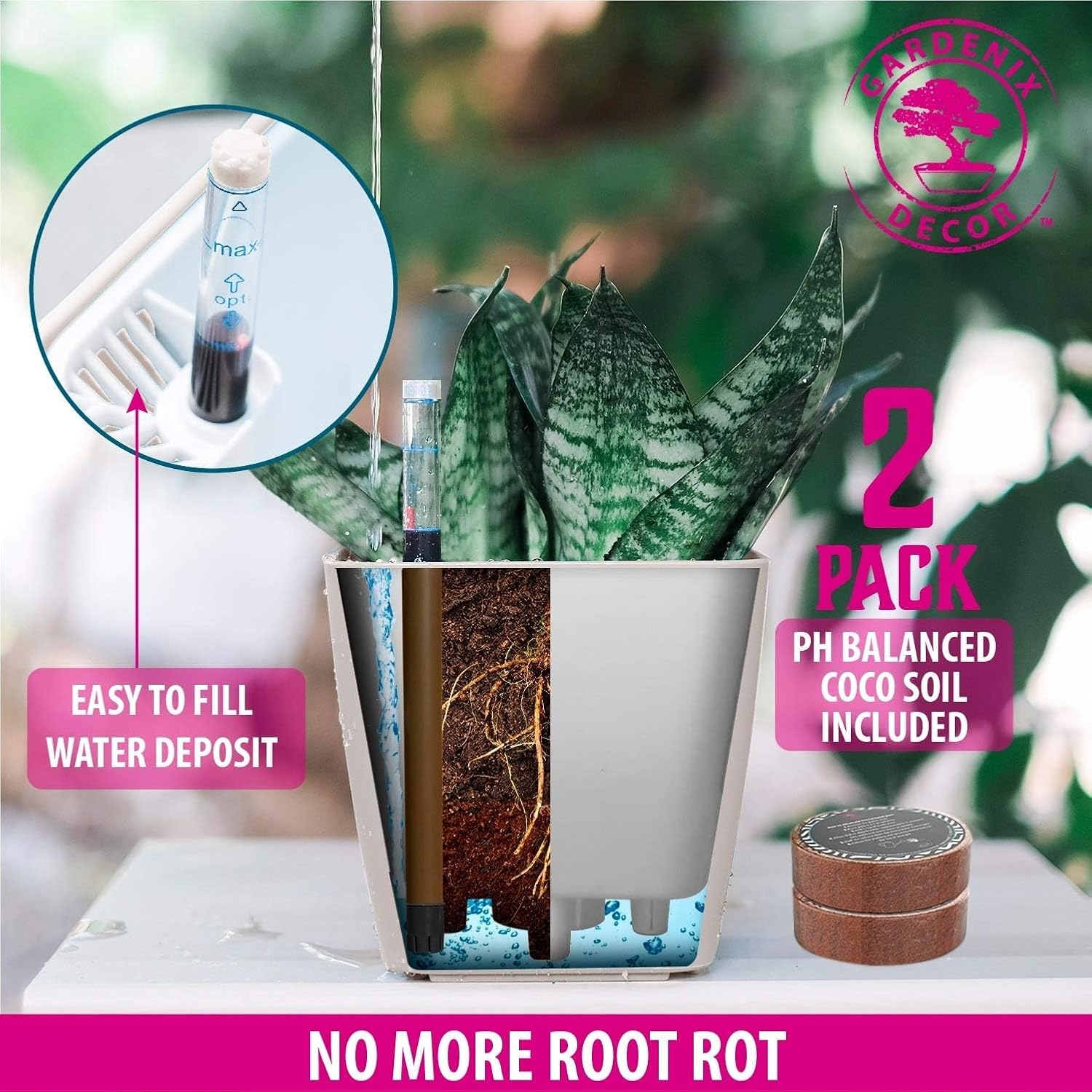 - At Gardenix Decor, We are here to help you keep your plants happy and thriving – even with a busy schedule. We’re plant people who know the joy and beauty plants bring to a home. We’ve designed our planters to function efficiently and self-sufficiently, to take care of your plant even when you can´t. If you aren’t completely satisfied with your self watering pots for indoor plants and outdoor plants, simply reach out to us directly so we can make it right.