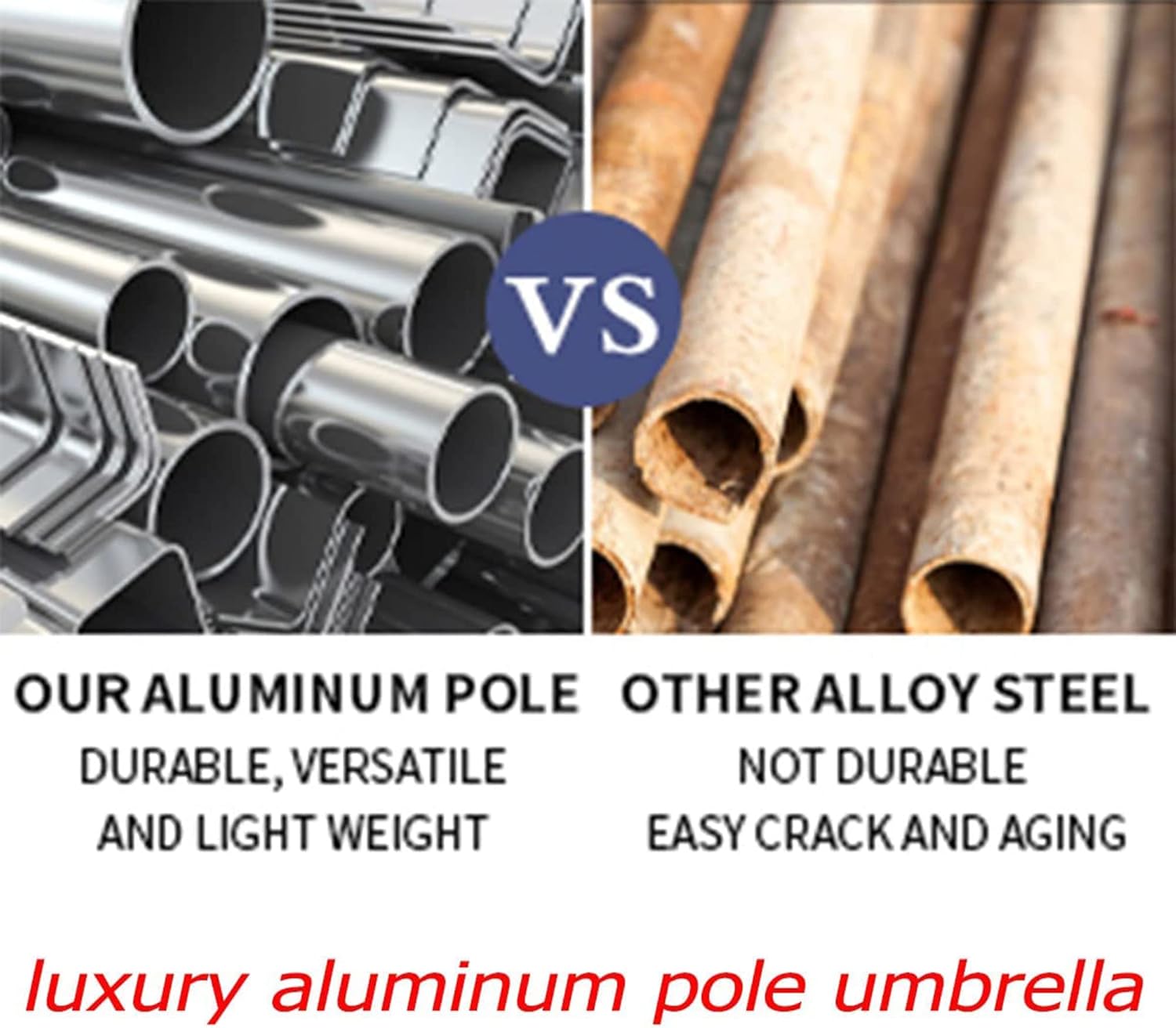 - DURABLE ALUMINUM UMBRELLA - Compared to the common alloy steel on the market, our 1.5 inches diameter aluminum pole umbrella has better corrosion resistance and longer service life. Able to maintain its good performance and appearance for a long time.