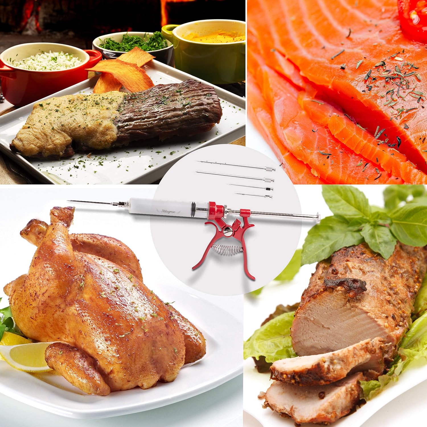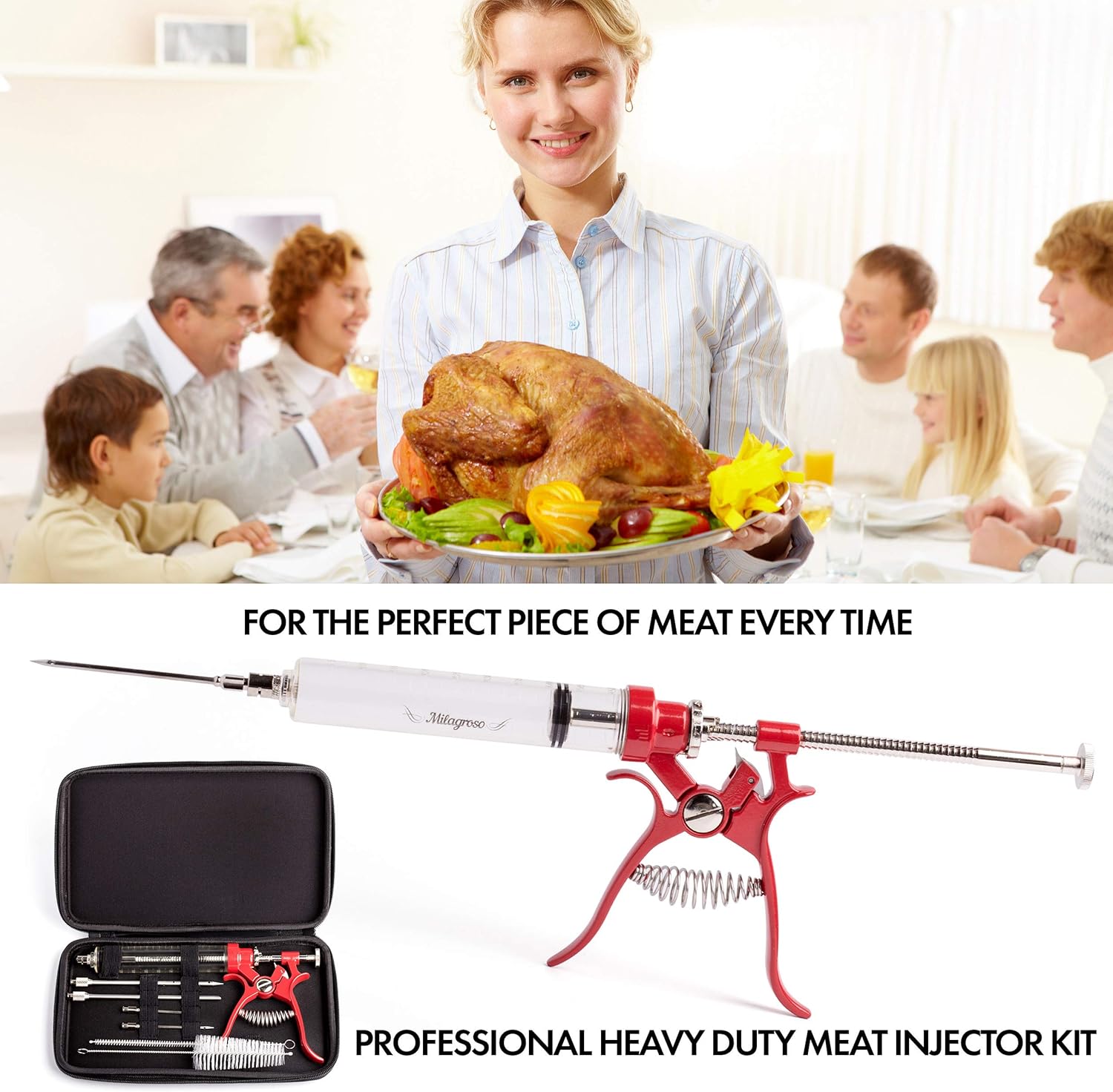 - π Lifetime Guarantee & ECO Friendly Package: 100% safe & healthy kitchen food injector syringe. Turkey injector and Silicone O-rings for spare replacement. Keep your family healthy with meat marinade injector.