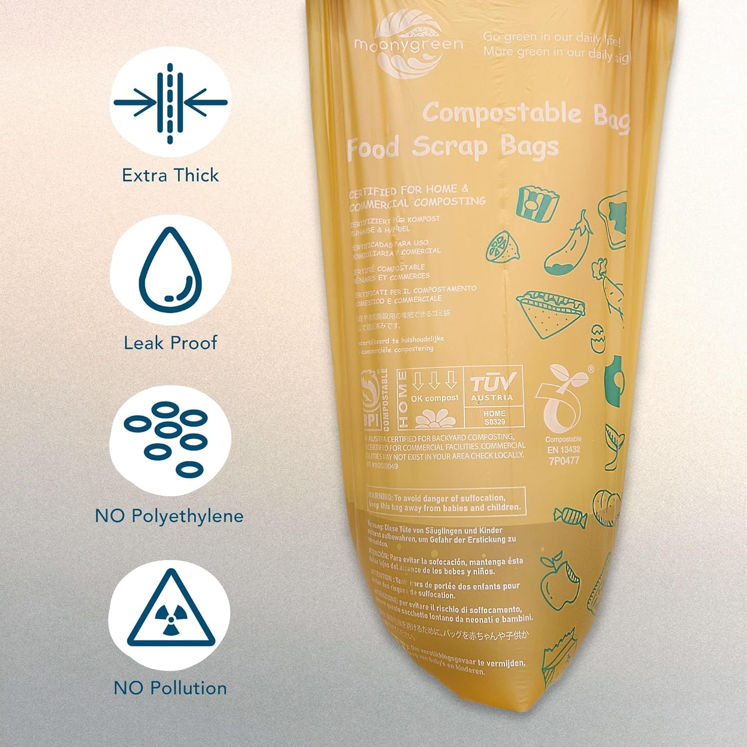 - β Moonygreen is one-stop solution for you : Moonygreen food scrap bags are Super-Thick, strong enough for household. The special design offer you ease in tearing off the bags. Non-Toxic feature makes you feel more secure when you use our bags. With Moonygreen, you can get a High-quality experience while protecting our Earth!