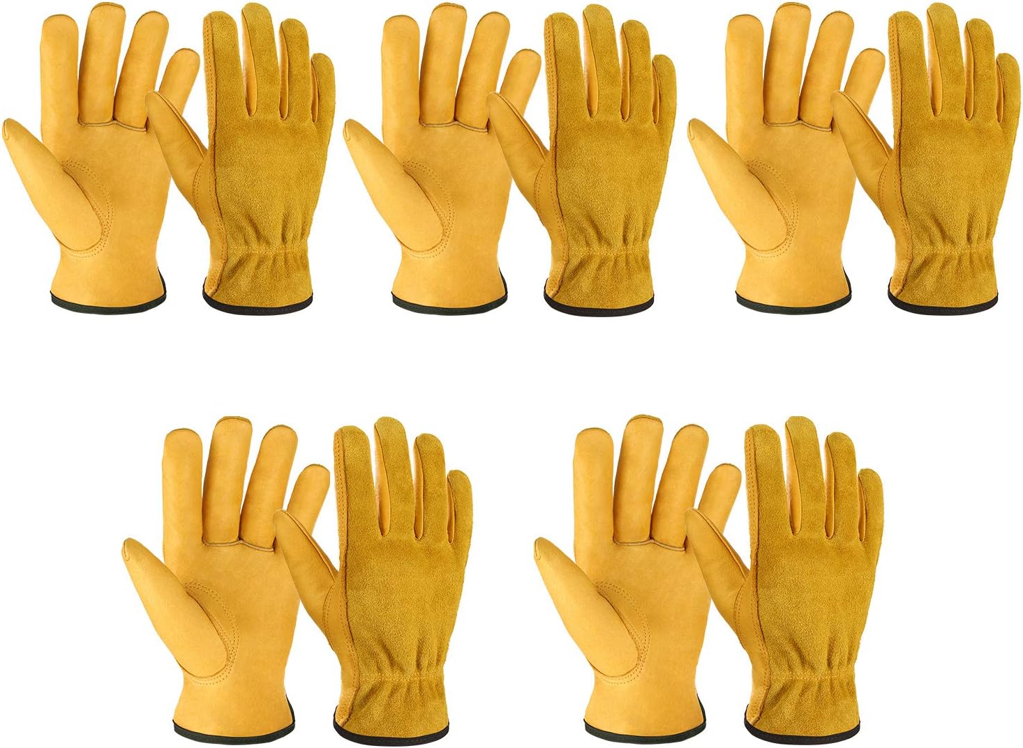 OZERO 5 Pairs Leather Work Gloves Flex Grip Tough Cowhide Gardening Glove for Wood Cutting/Construction/Truck Driving/Garden/Yard Working for Men and Women (Gold,Small)