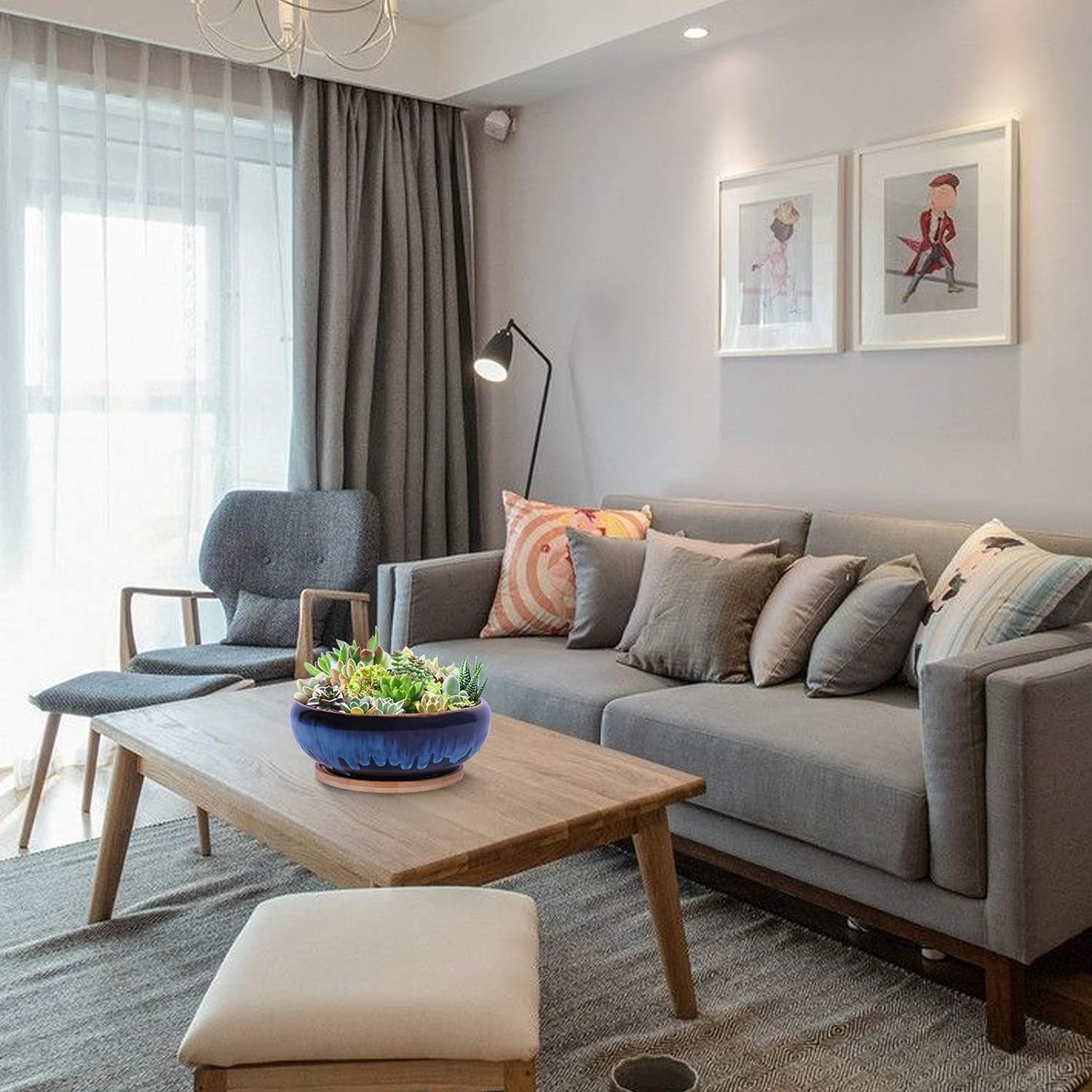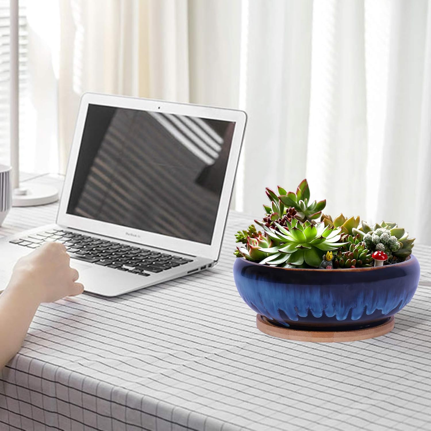 SQOWL 7 Inch Round Ceramic Succulent Planter Pot Drip Glazed Shallow Planter with Drainage Bamboo Tray for Indoor Plants