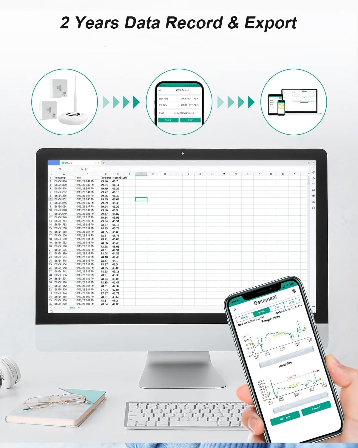- 2-Year Data Storage and Export: The smart temperature sensor on MOCREO APP provides clear charts for tracking temperature/humidity trends over time. You can enjoy 2 years of free data storage and CSV table support for detailed analysis
