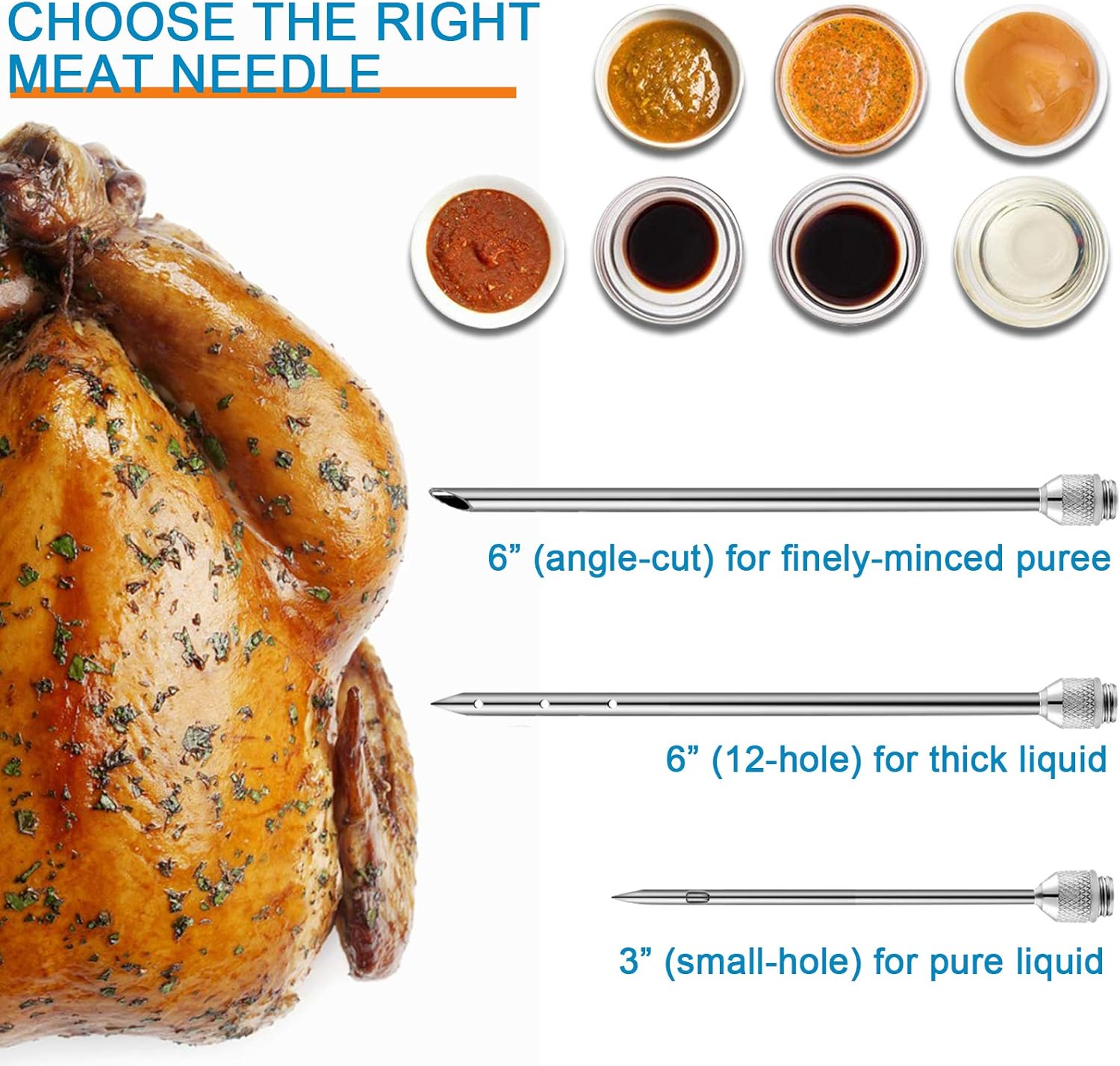 - Easy to Use and Creative Gift --- The syringe and needle are easy to remove and assemble. High-capacity syringe barrel minimizes refill to the utmost extent, save your time. Ergonomically designed handles provide comfortable grip and friendly pressure control; 3 interchangeable single and perforated turkey needles that penetrate deep into meat and perfectly distribute sauces, for turkey, beef, pork, lamb, chicken, goose and duc.