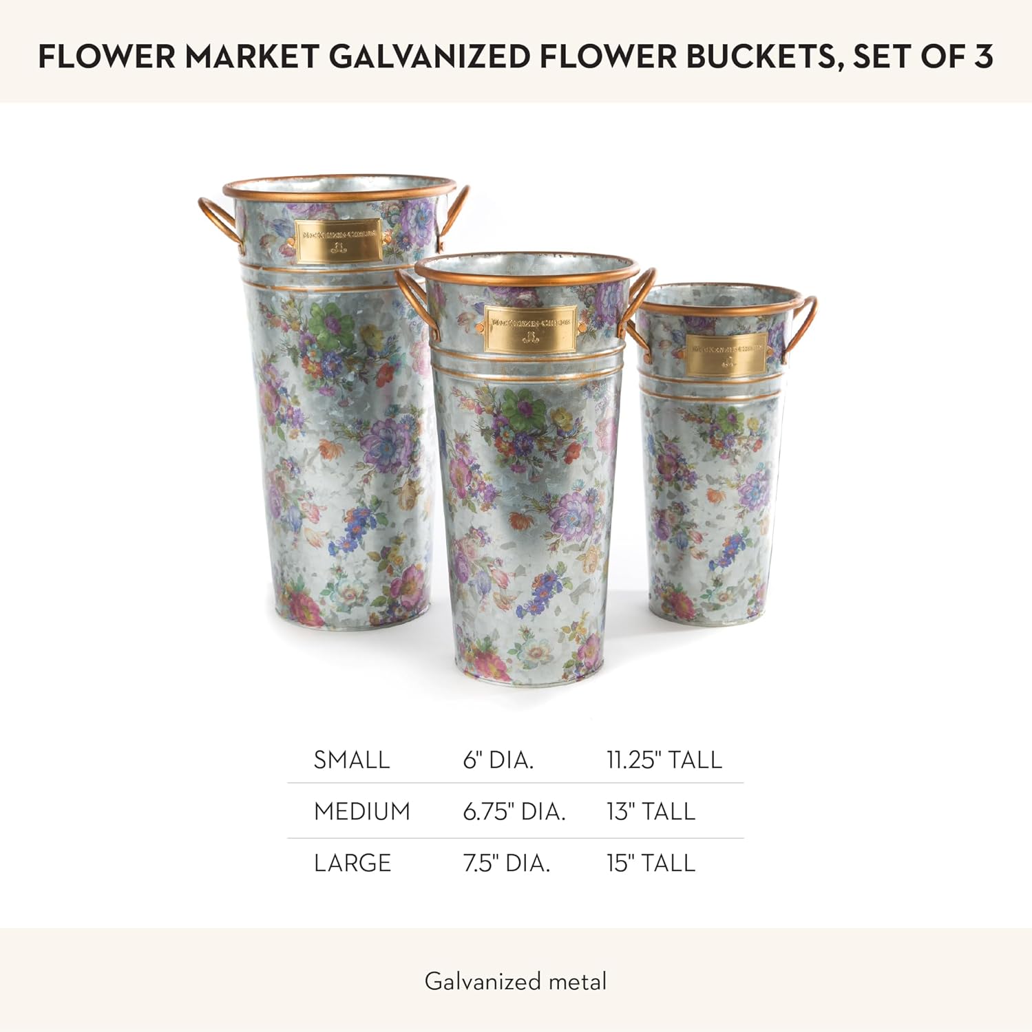 MACKENZIE-CHILDS Galvanized Flower Buckets, Decorative Metal Buckets, Flower Market, Set of 3