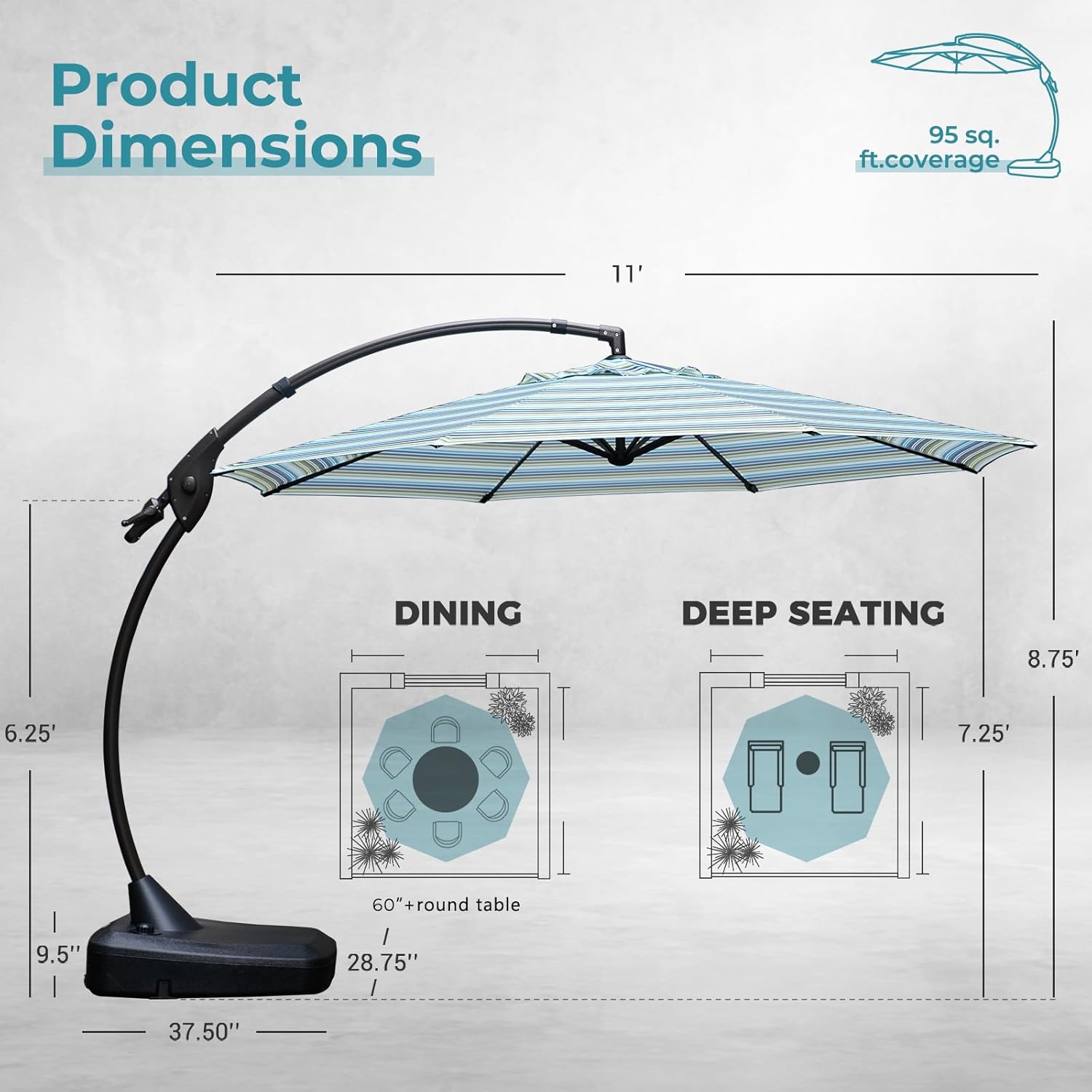 - COVER A LARGE AREA: This cantilever umbrella from our Napoli collection provides 95 square feet of relaxing cooling shade. Stay in the shade with our clever auto-lock system that allows you to reposition the tilt of the umbrella exactly where needed as the sun movt the day. Modern stripes umbrella canopy is the perfect blend of form and function, shielding you from the sun's relentless rays and transforming your garden, poolside oasis