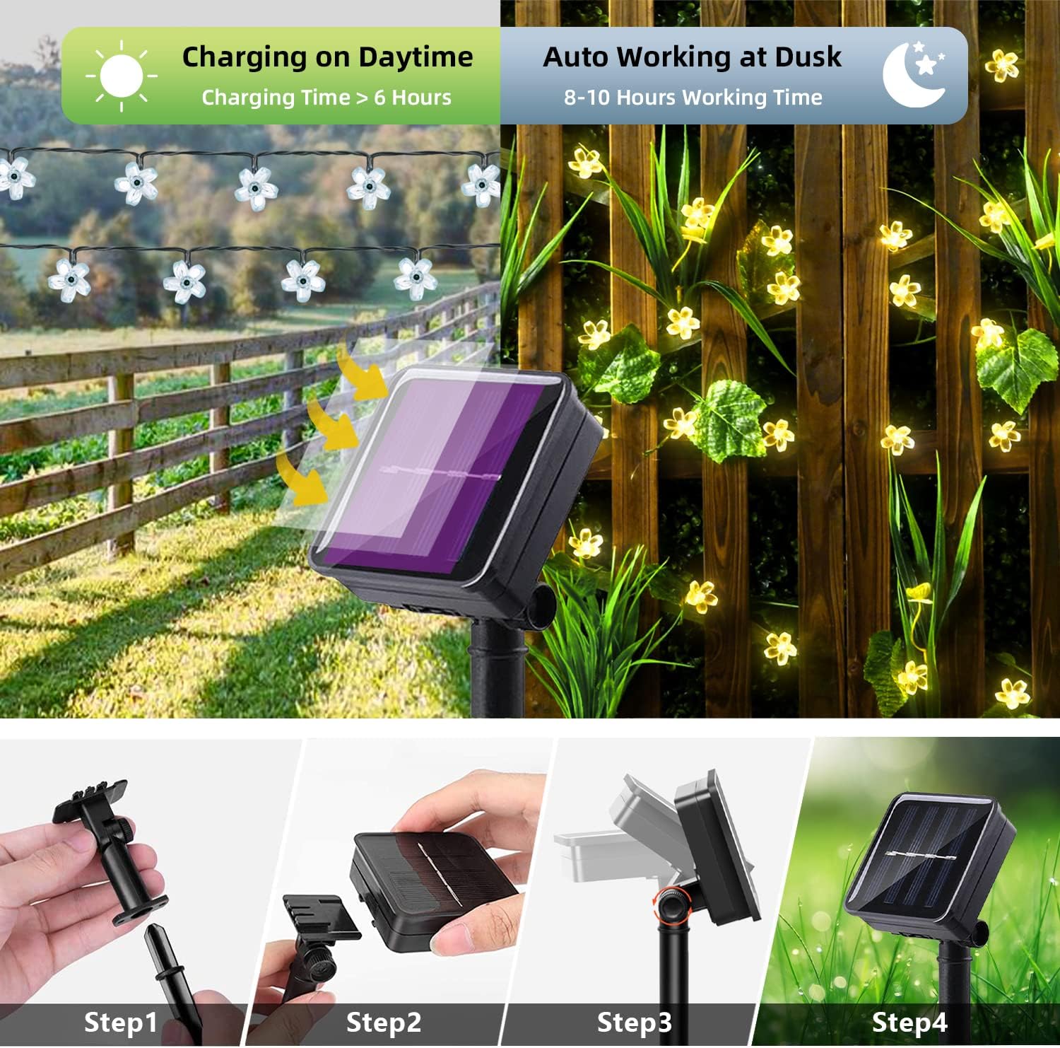 - Perfect Indoor & Outdoor Decor-- Solar flower string lights,realistic and vivid 50 soft plastic crystal peach blossom LED lights,it emits warm white light, bringing you dreamlike beauty, perfect match with Christmas tree and garden fence, fantastic decoration for holiday, garden, patio, yard, wedding, party, tent, gazebo, etc.