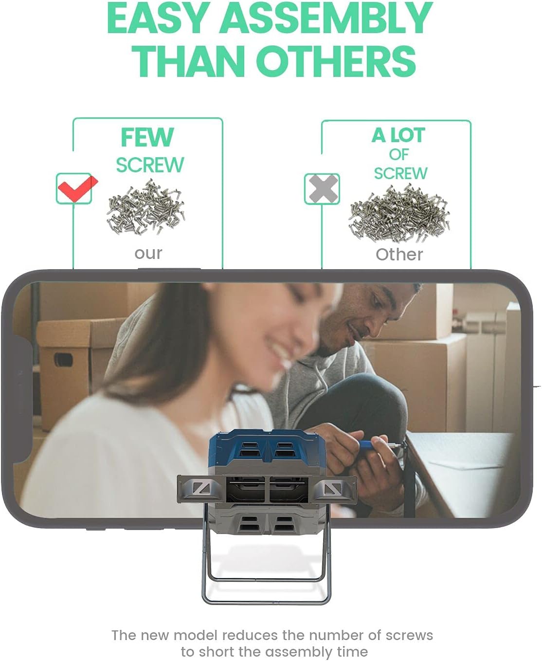 - Short Assembly Time - 2021 new version composter has reduced the screw Qty for easy assembly and modify middle panel to closely separate the two chamber.