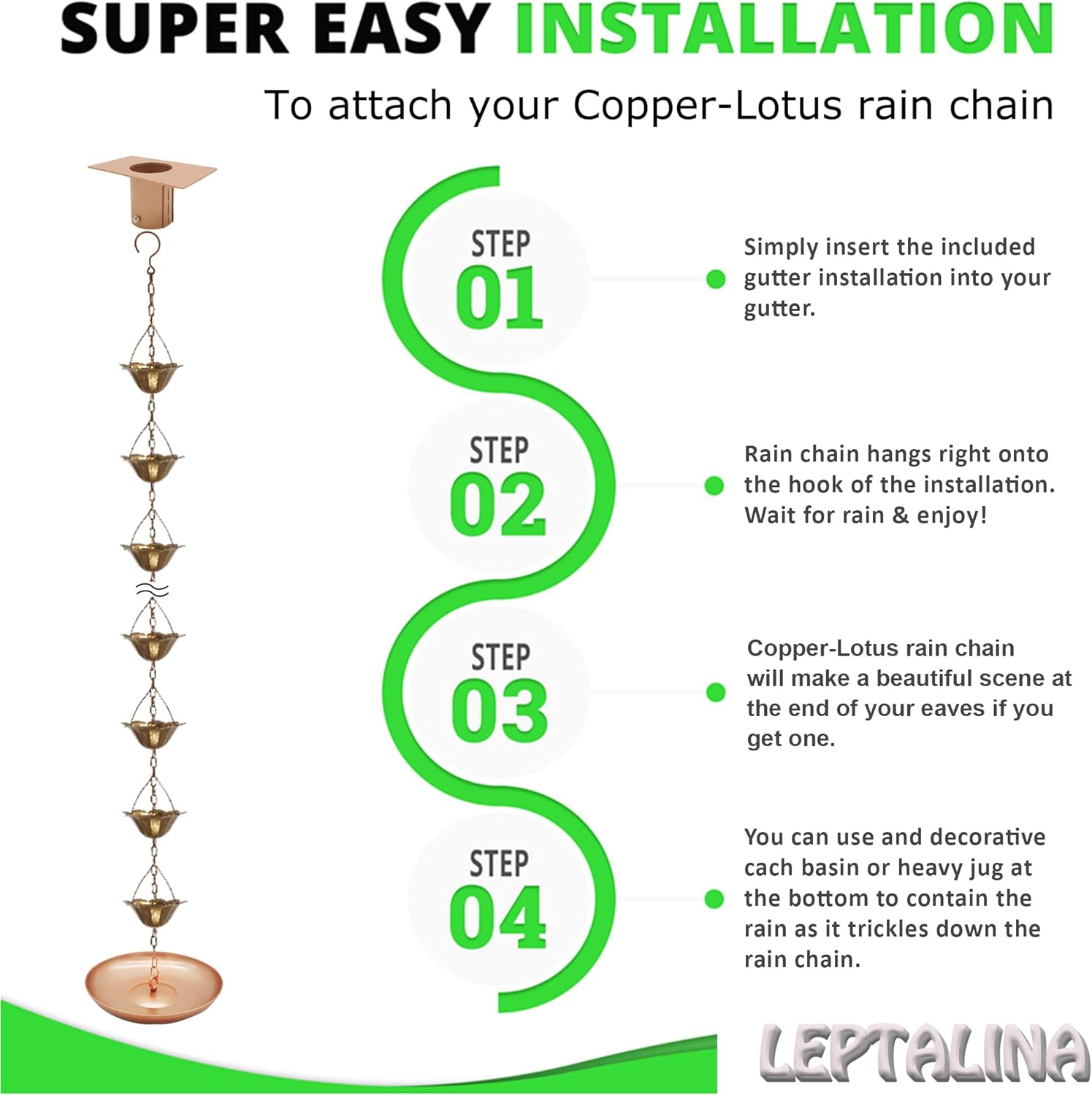 - Featuring 12 beautifully ornate lotus cups, our rain chain adds a chic touch to your roof, awning, or shed. Moreover, all components of the rain chains are painted in a copper color, to perfectly complement your roof and garden decor.