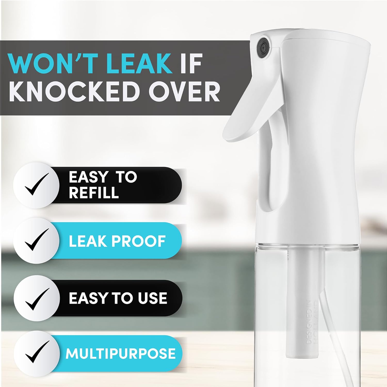 - 【Leak Proof, 360° Spray】Our unique design provides maximum versatility using the option to spray in any angle, while protecting your countertops and surfaces by eliminating any leaks. Keep the water exactly where you want it: inside the bottle and spraying according to your directions!