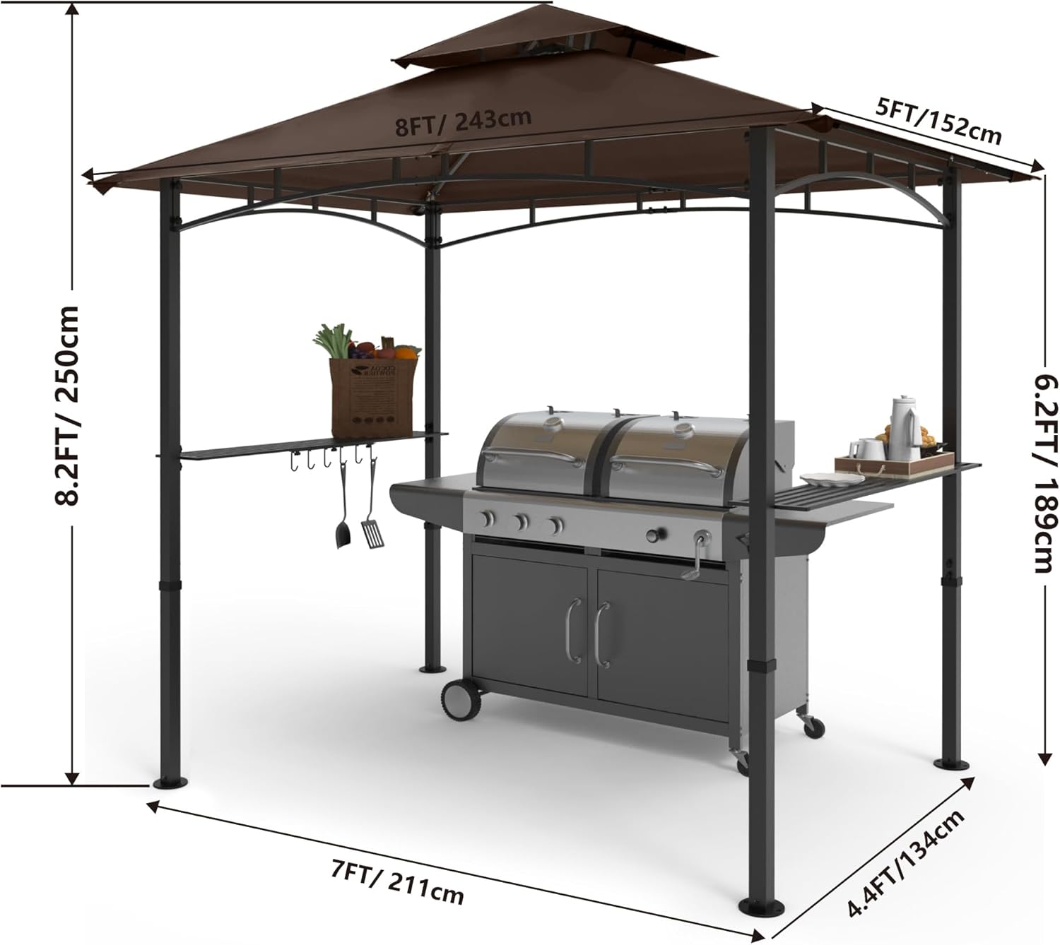 - 【Ideal for Outdoor Grilling】: This grill gazebo creates a perfect spot and patio shade for you to enjoy BBQ party and cooking with 8' x 5' large footprint in the backyard.