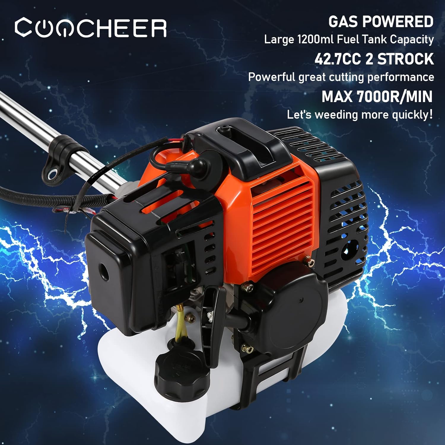 - 🌿With 4 Detachable Trimming Head👍 Equipped with four kinds of cutting head: 2*0.08'' dual line bump feed head,a brush cutter blade and a Circular saw blade this 4-in-1 Gas Trimmer and Brush Cutter allows you to do multiple chores with one machine. Not only can trim weed and lawn grass quickly with a 10’’ cutting path, but also can cut bush, shrubs, thick grass or vegetation with an 18’’ cuttin