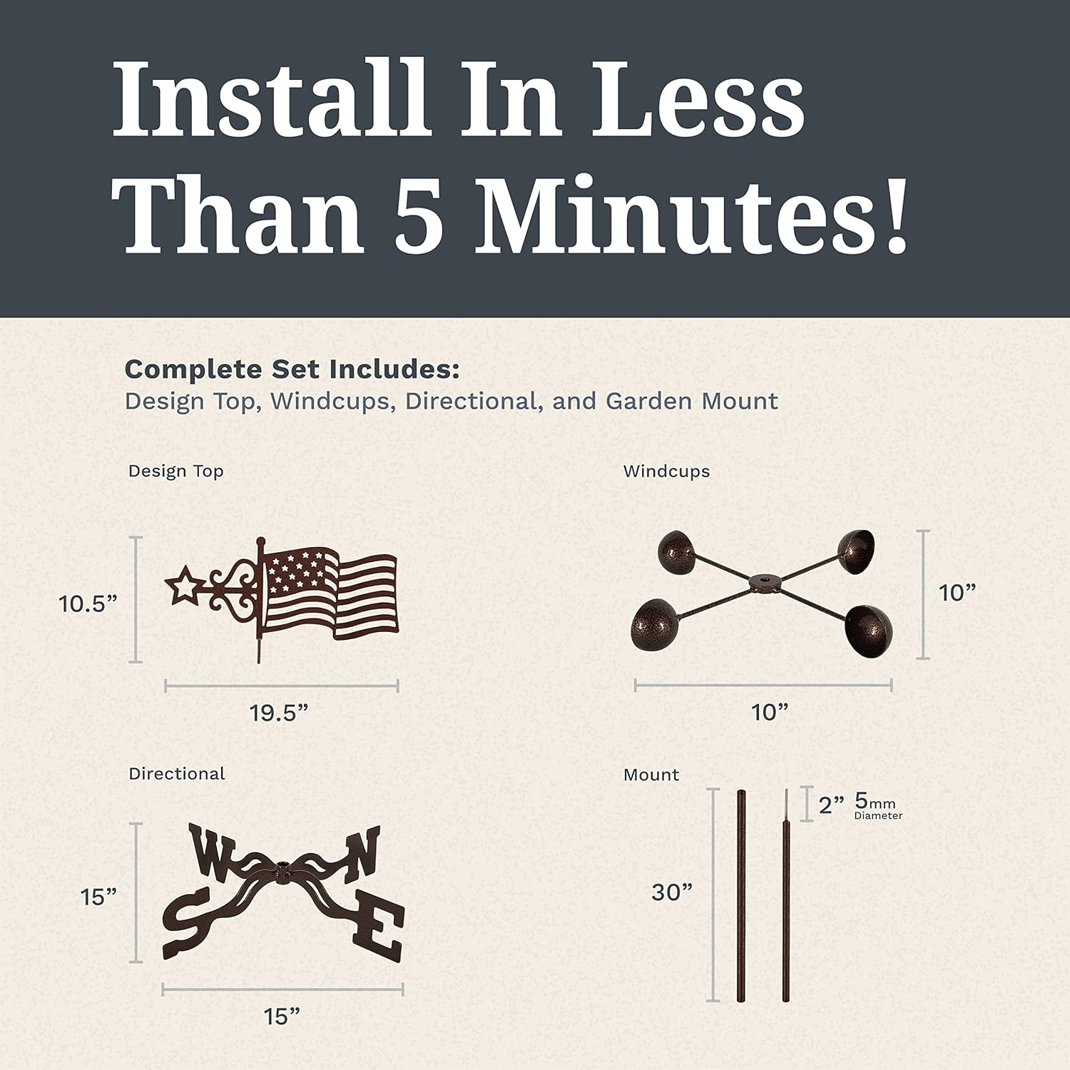 - Complete Kit – EZ Vane USA Flag weathervane includes an intricate laser-cut USA Flag design topper, garden mount, windcups with sealed ball bearings, and an EWNS indicator to show wind direction.