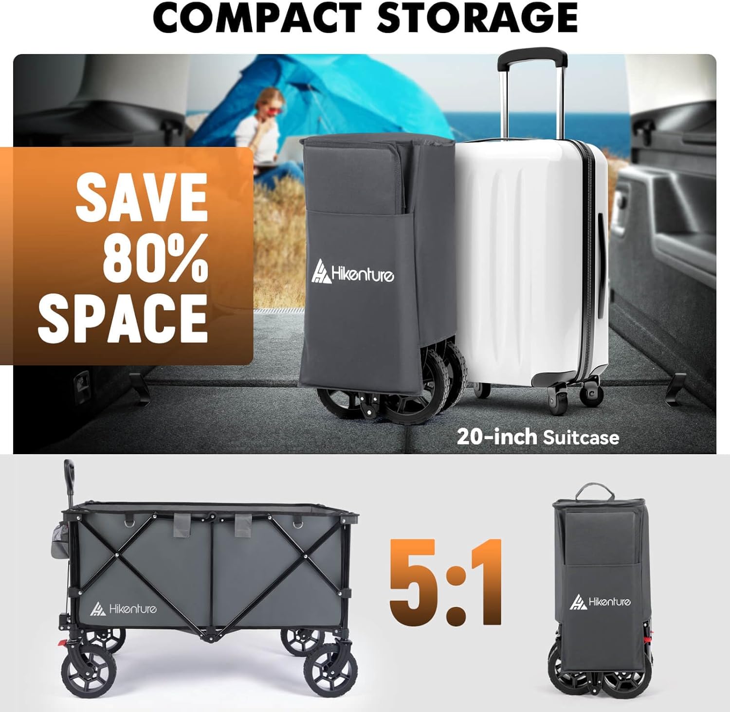 - ๐๐๐๐๐๐๐๐ ๐ ๐๐๐๐๐๐ ๐๐๐๐ ๐๐จ๐ซ ๐๐๐ฌ๐ฒ ๐๐ญ๐จ๐ซ๐๐ ๐: Surprise yourself with our fold up wagon which collapses down extremely compact in just seconds! Taking the easy transport as well as a space-saving storage into consideration, we have upgraded our beach cart with an advanced construction and reduced its folding size to approx. 9" x 11.4" x 24.4", allowing it to be easily stored in the trunk of your car, your closet or garage while only minimum space is needed.