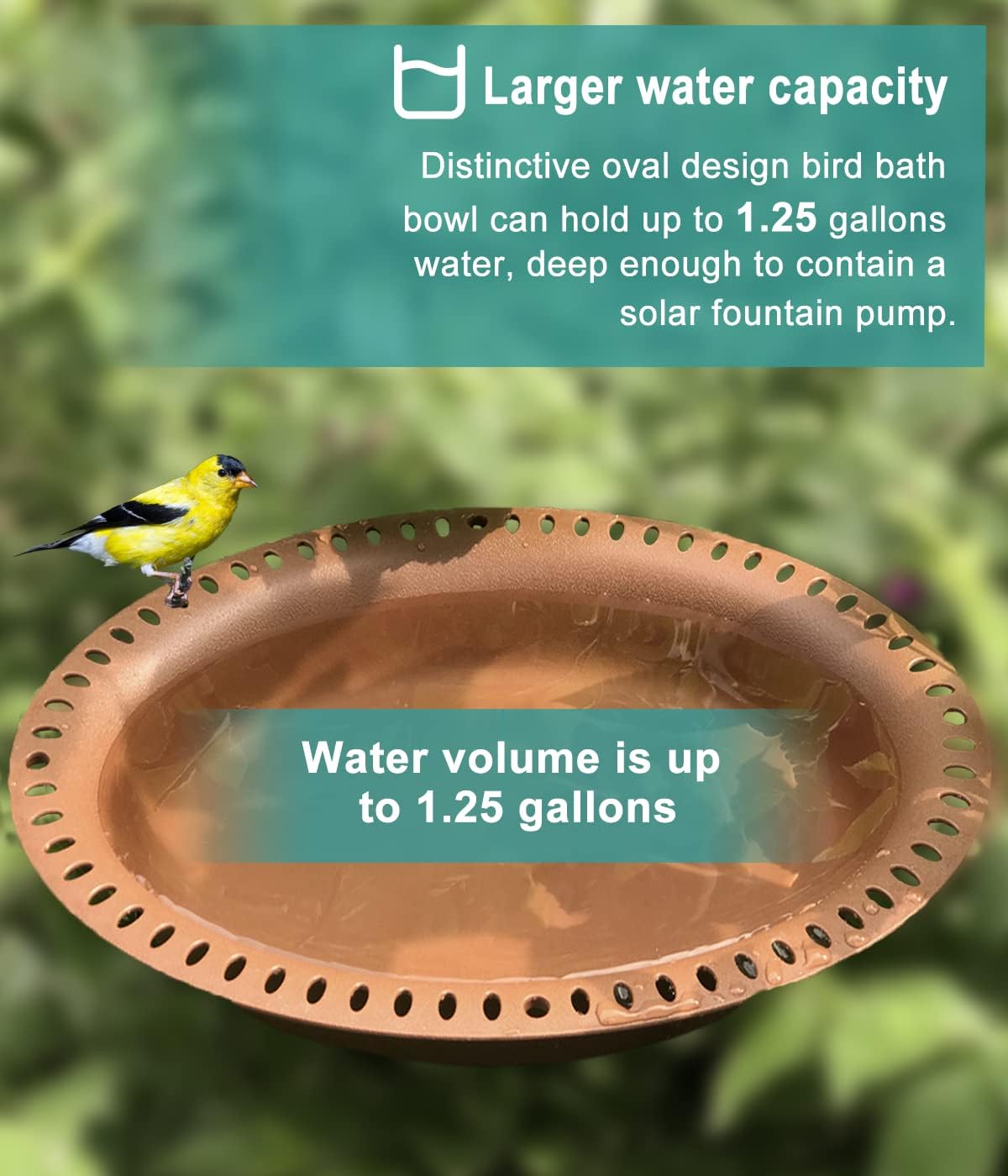 - More capacity & Oblong shape: This extra-large bird bath has an OBLONG tray with small holes along the edges, providing a stable standing and resting environment for the lovely bird friends. Bird friendly color--Chocolate color basin is gentle and unobtrusive in your outside areas, and deep enough for contain a solar fountain pump. (Bowl dimension: 17.2β L Γ 13.2β W, bowl depth: 2.76 inches.)