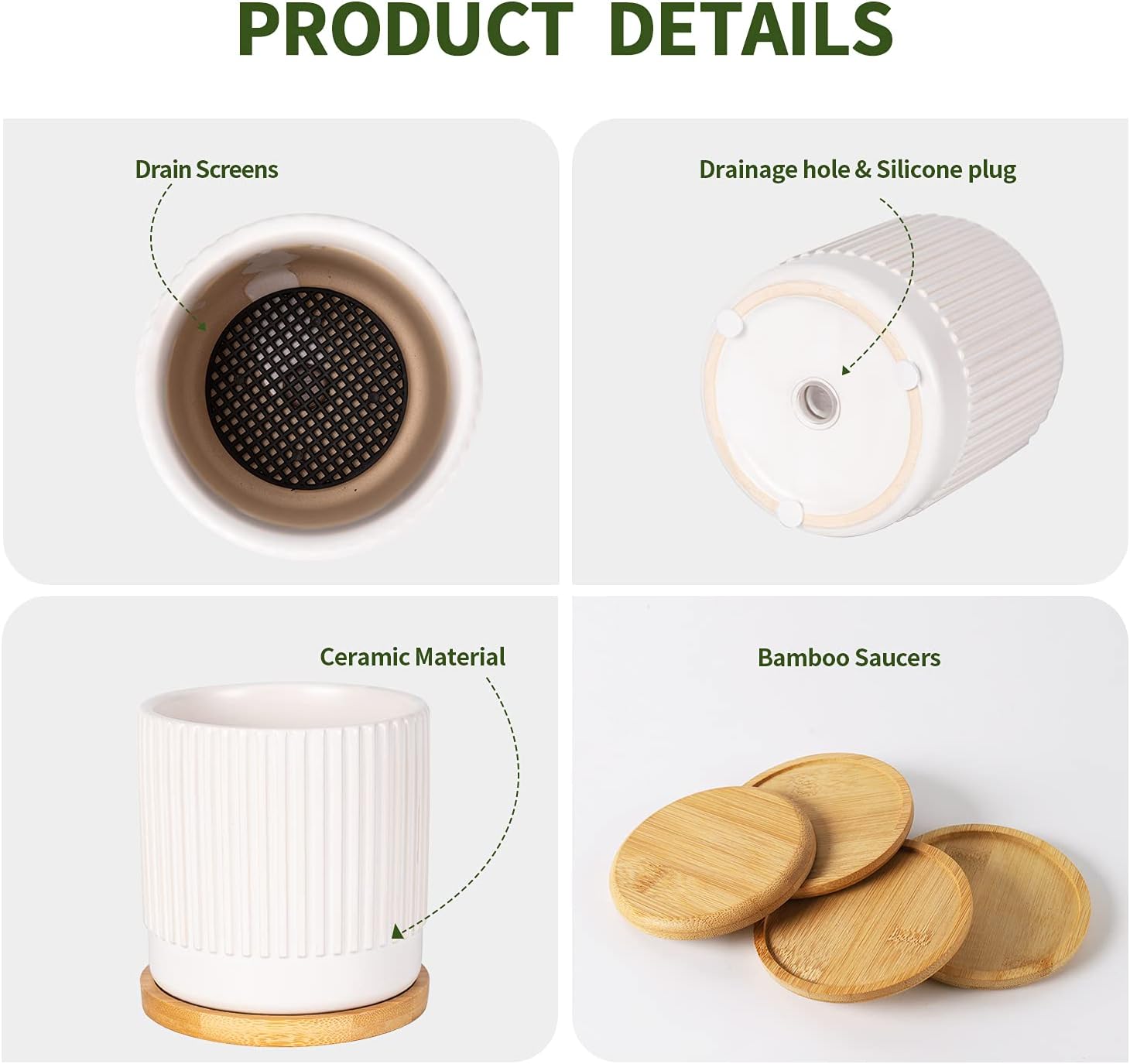 - Modern Design Planters: White plant pots surface with elegant stripes design full of artistic sense. Simple style indoor plant pots will be placed in various suitable scenes, such as courtyards, balconies, and other places that need to be decorated.