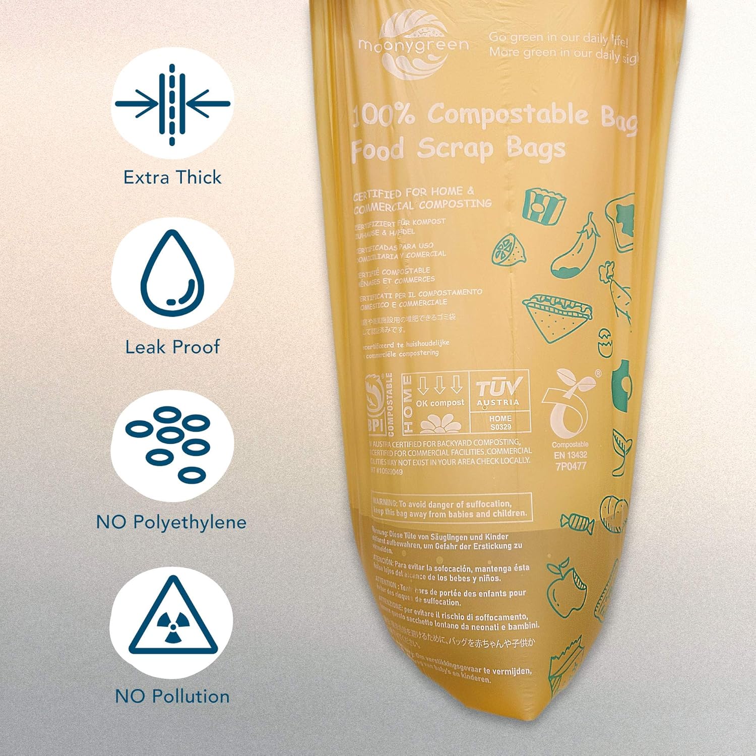 - β Moonygreen food scrap bags have acquired the highest-rated ASTM D6400, European standard EN 13432, OK Compost Home Certification and BPI certified, proving that the bags are compostable in about 90 days with home-composting as well as in industrial facilities.