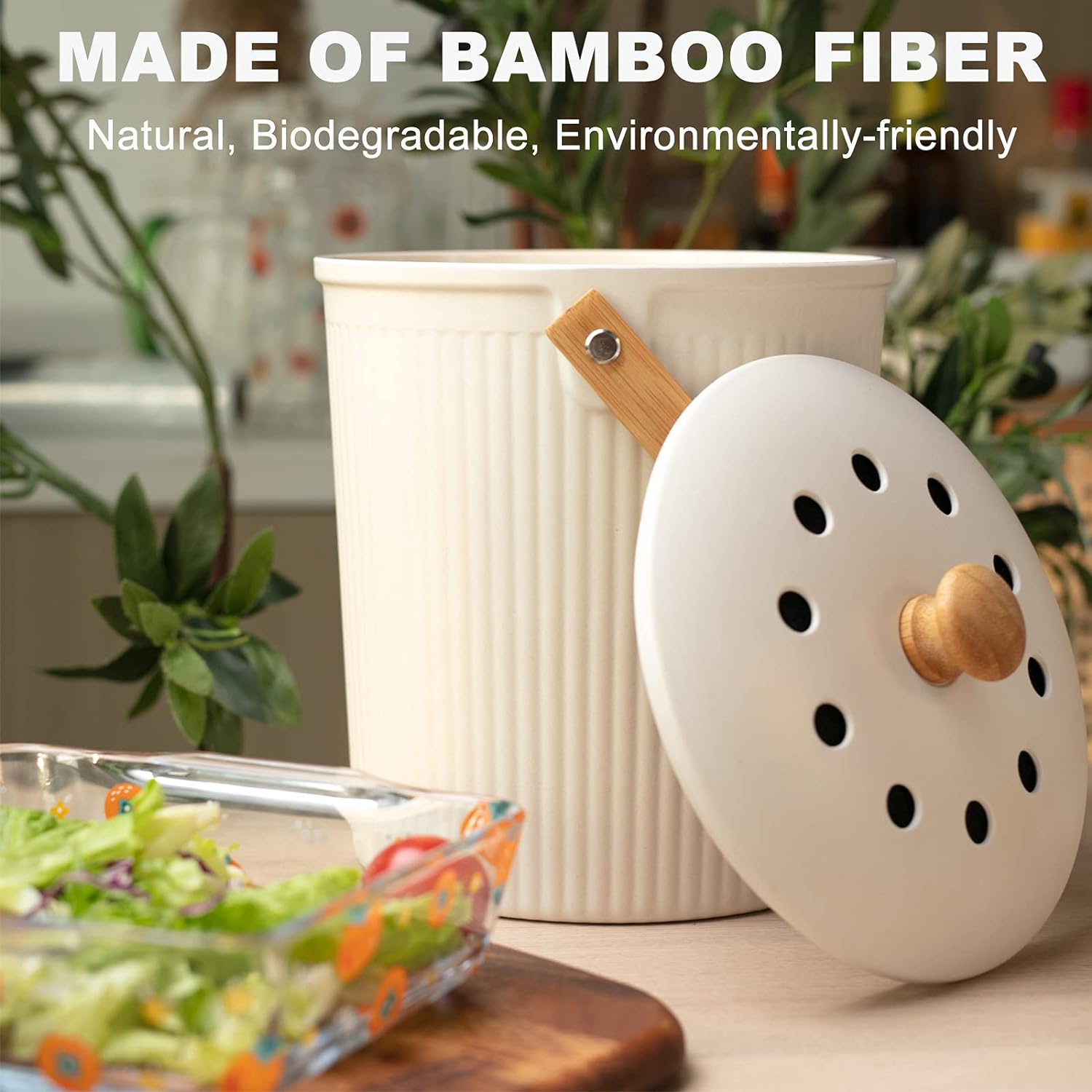 - All Natural: Made from earth-friendly recycled materials including Bamboo Fiber, Corn Starch, the kitchen compost container with lid in itself is biodegradable.