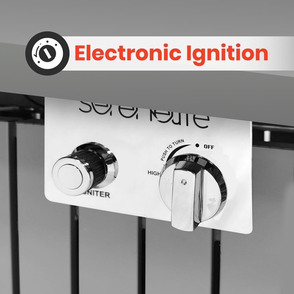 - EASY TO USE: Easy to assemble with two persons & takes only 20-30 minutes to put together. Has an assembled gas hose regulator, control panel, & adjustable flame height by valve knob. Has auto flame-out protection device making it safer & more secure