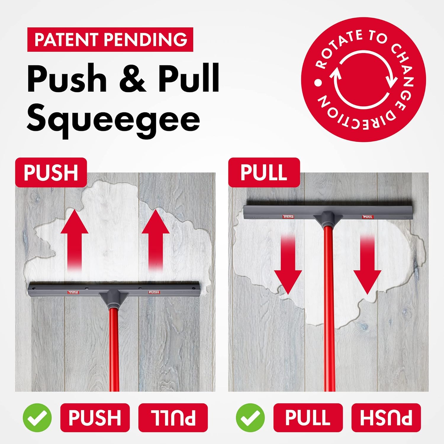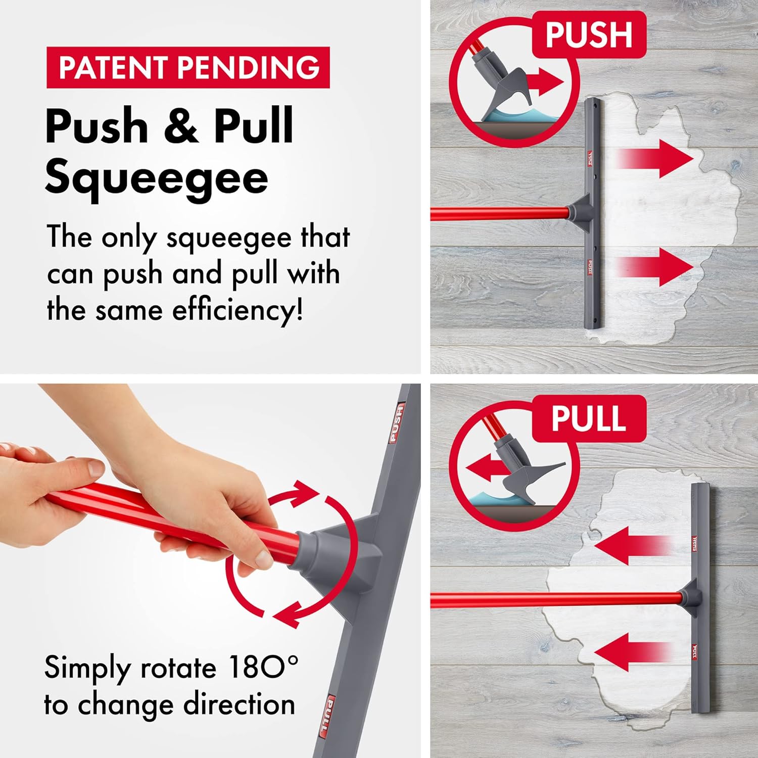 - PUSH & PULL ACTION: With a simple twist of the handle, this patent-pending push-and-pull floor squeegee provides exceptional cleaning performance in multiple directions. Simply rotate the handle 180 degrees to effortlessly push or remove spills using this versatile squeegee for floor.