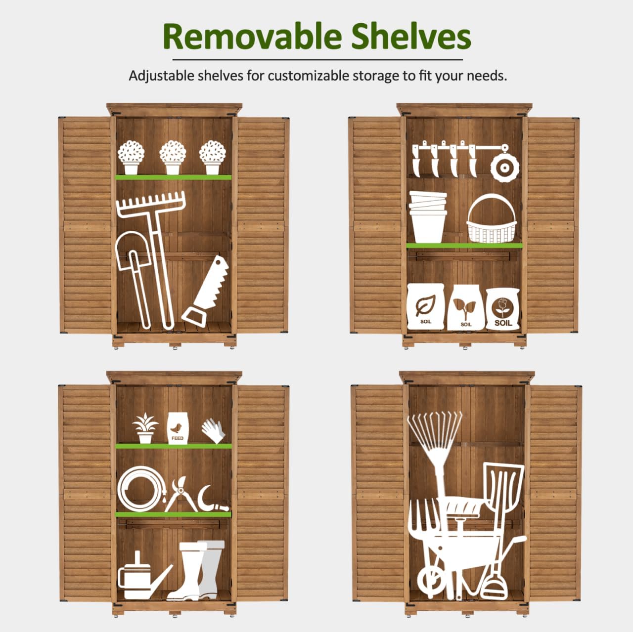 - 2 Removable Shelves: The shelves of the outdoor cabinet storage can be easily taken out, and 4 different storage spaces are constructed to store your various garden tools, feed, pool chemicals and equipments, etc.