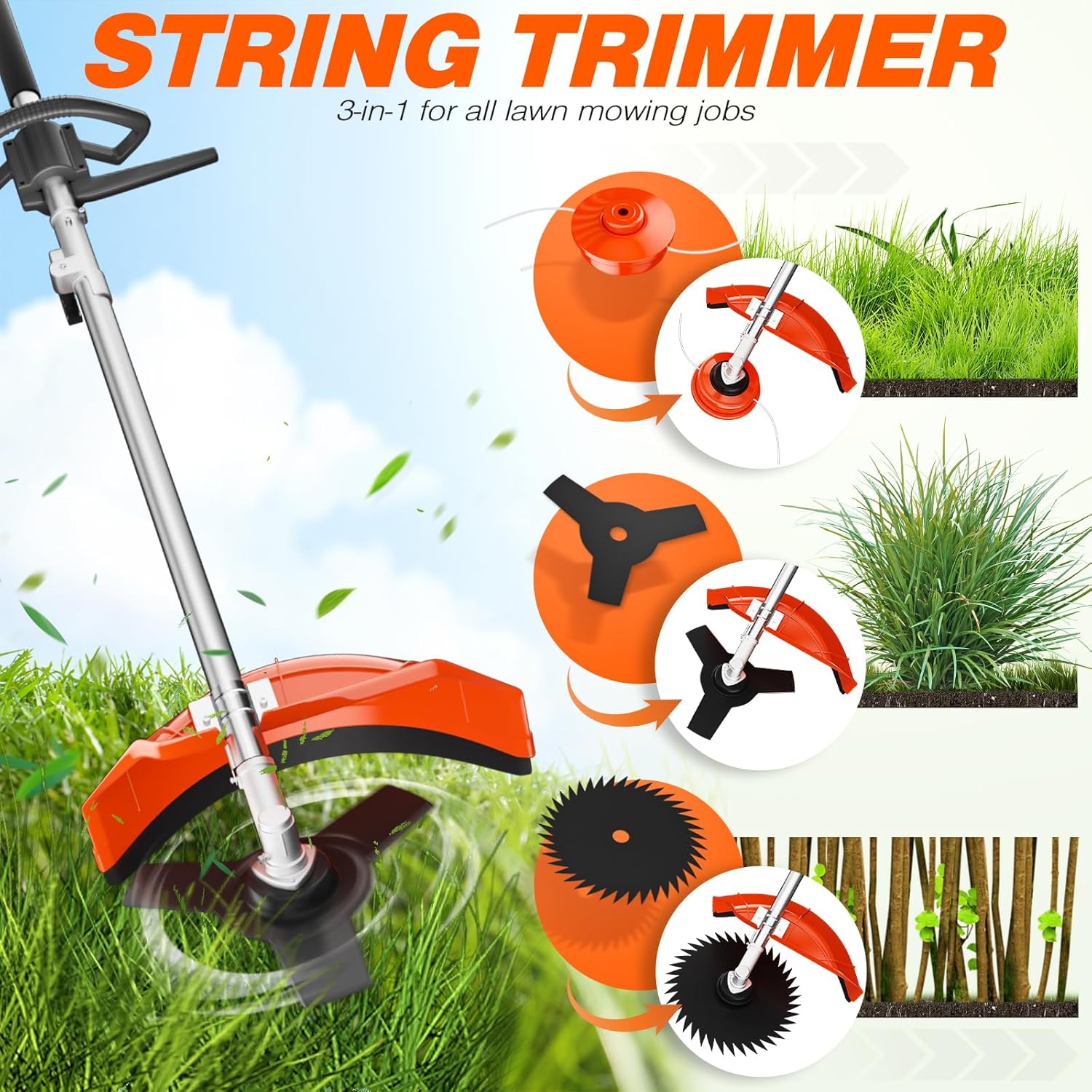 - Assemble the attachments,you will get 1 x brush cutter;1 x grass cutter (with four mowing heads);1 x chainsaw.With 1 extension pole,which create diversity when tackling the outdoor yard garenden job.