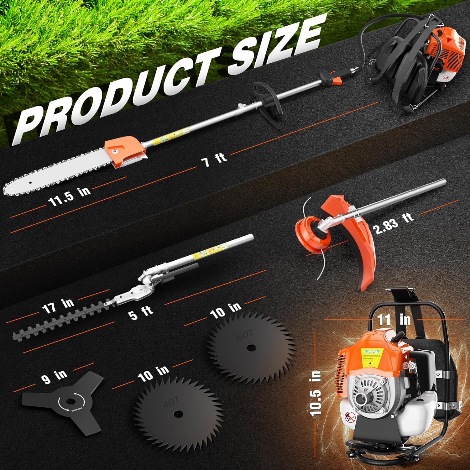 - Powered by the engine (52cc 2-stroke, Power 1100w), this powerful long reach 11.35FT(Total length) chainsaw (Pruner) lets you easily reach tall tree branches without a ladder.With backpack holder,the garden work effortless