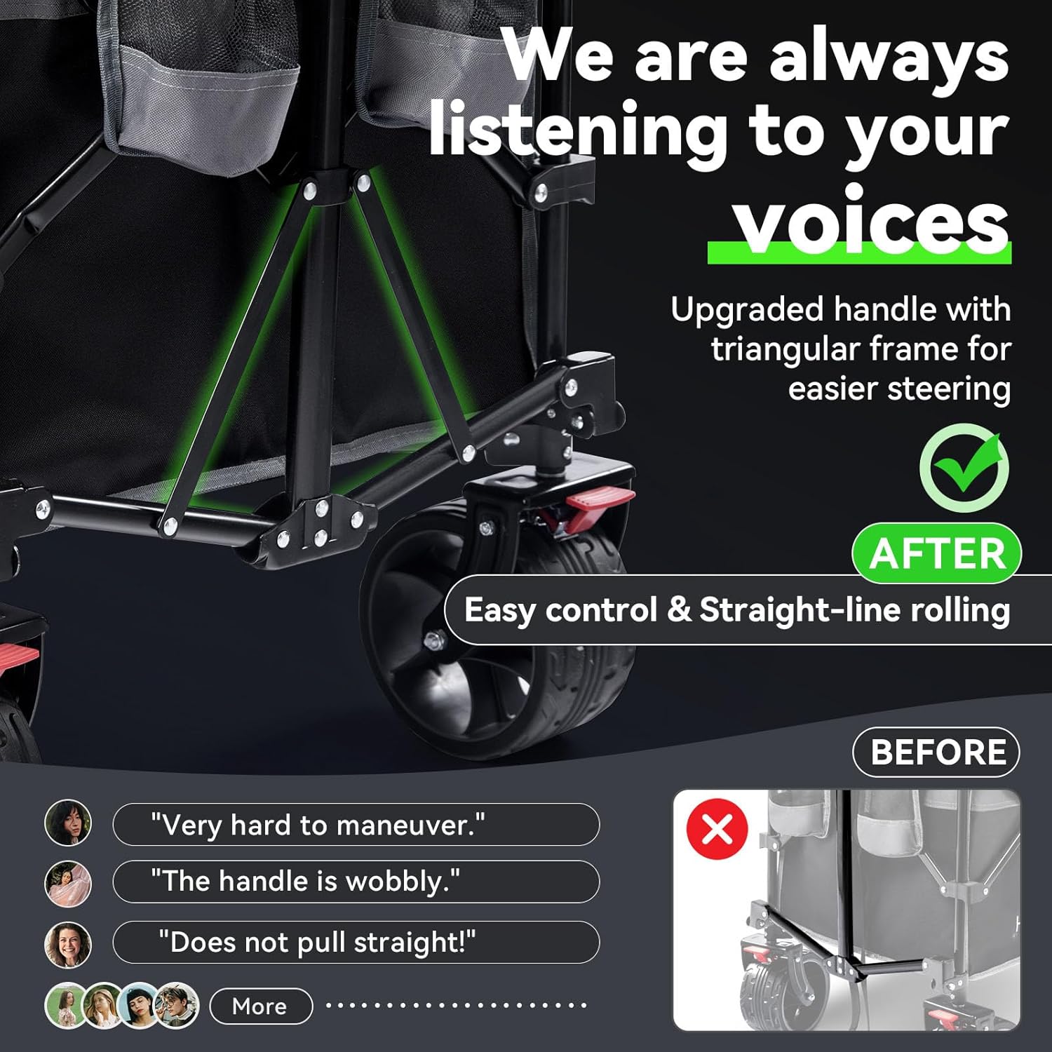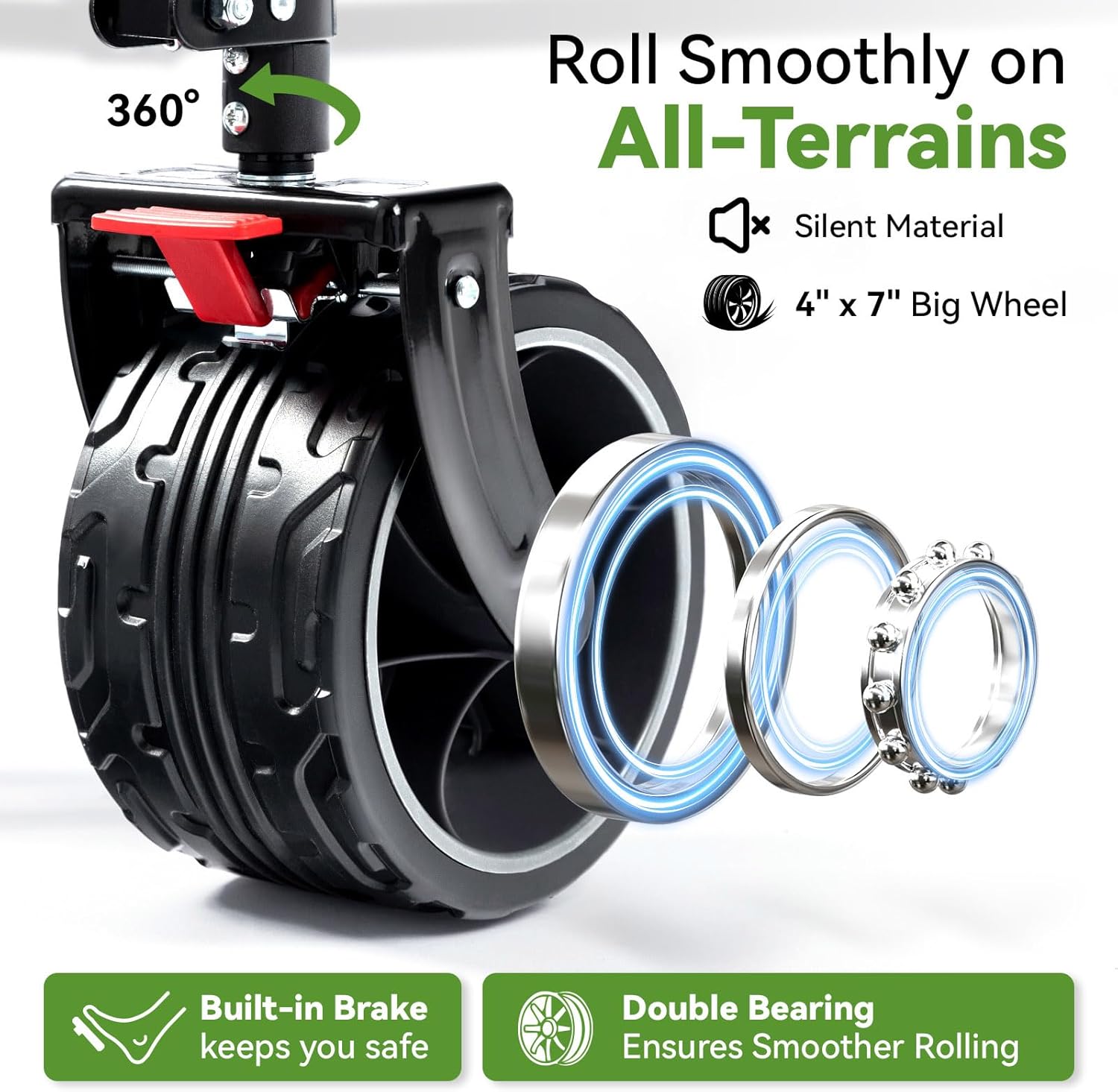 - π-πππππ β ππππππππ ππππππ πππππππ πππ ππππππππ - Super large 4" wheels with unique anti-slip pattern make our collapsible wagon extremely capable of transporting load on multiple terrains, including sandy beach, grass and even rough terrains. The wheels of our beach cart are significantly wider than similar folding carts, resulting in dramatically better steering. The dual front wheels are 360-degree rotatable for easy maneuvering.