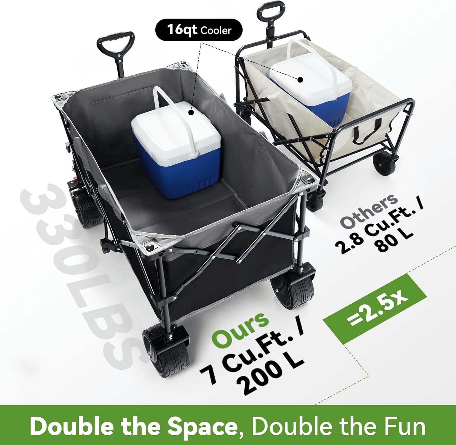 - π-ππππππ β πππππ πππππππ β You could hardly find a larger one. Our beach wagon is designed to be a real carryall. With a deeper and larger storage space, our wagon cart stands out from others thanks to its surprisingly enlarged capacity of 200L / 7 cubic feet, which means 3-4 times the capacity of a 24-inch suitcase or 5-7 times of a 20-inch suitcase. Just load it with everything you need and enjoy a nice adventure in the sun!