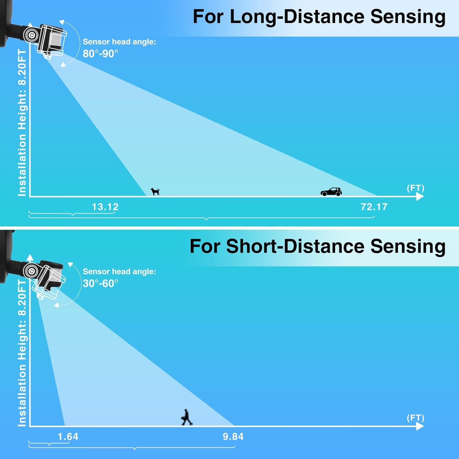 - Adjustable Sensing Mode: You can use the 3 knobs at the back of the sensor to adjust the detection distance, lighting duration and ambient brightness to activate the sensor. Setting the security light to work only at night or both day and night. 180° ultra-wide sensing range, 32.8ft sensing distance and 7~420S continuous illumination time provide you with a larger viewing area for an excellent nighttime experience. Tips: Not Solar Powered