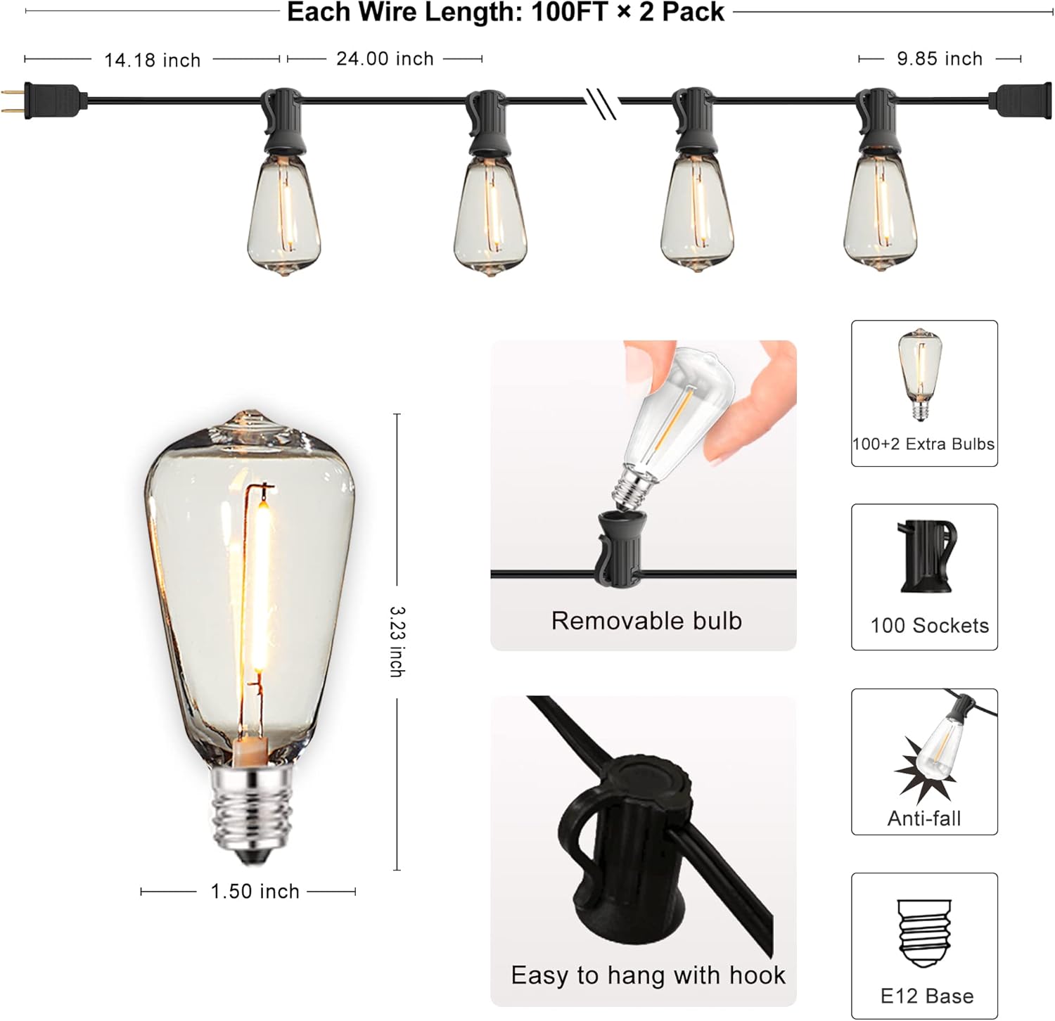- Connectable and Easy Installation ST38 long dimmable string lights - 1.18 Ft lead with male plug, 2.00 Ft spacing between bulbs, 0.82 Ft tail with female connector. Each market light strand 50 Watts, End to end connectable up to 8 pack easily Simple Installation and easy-to-use socket loop design allows for hang up and installation anywhere thatβs desired β hang all weather string lights in outdoor rafters for backyard, parties and weddings, or indoors for urban inspiration.