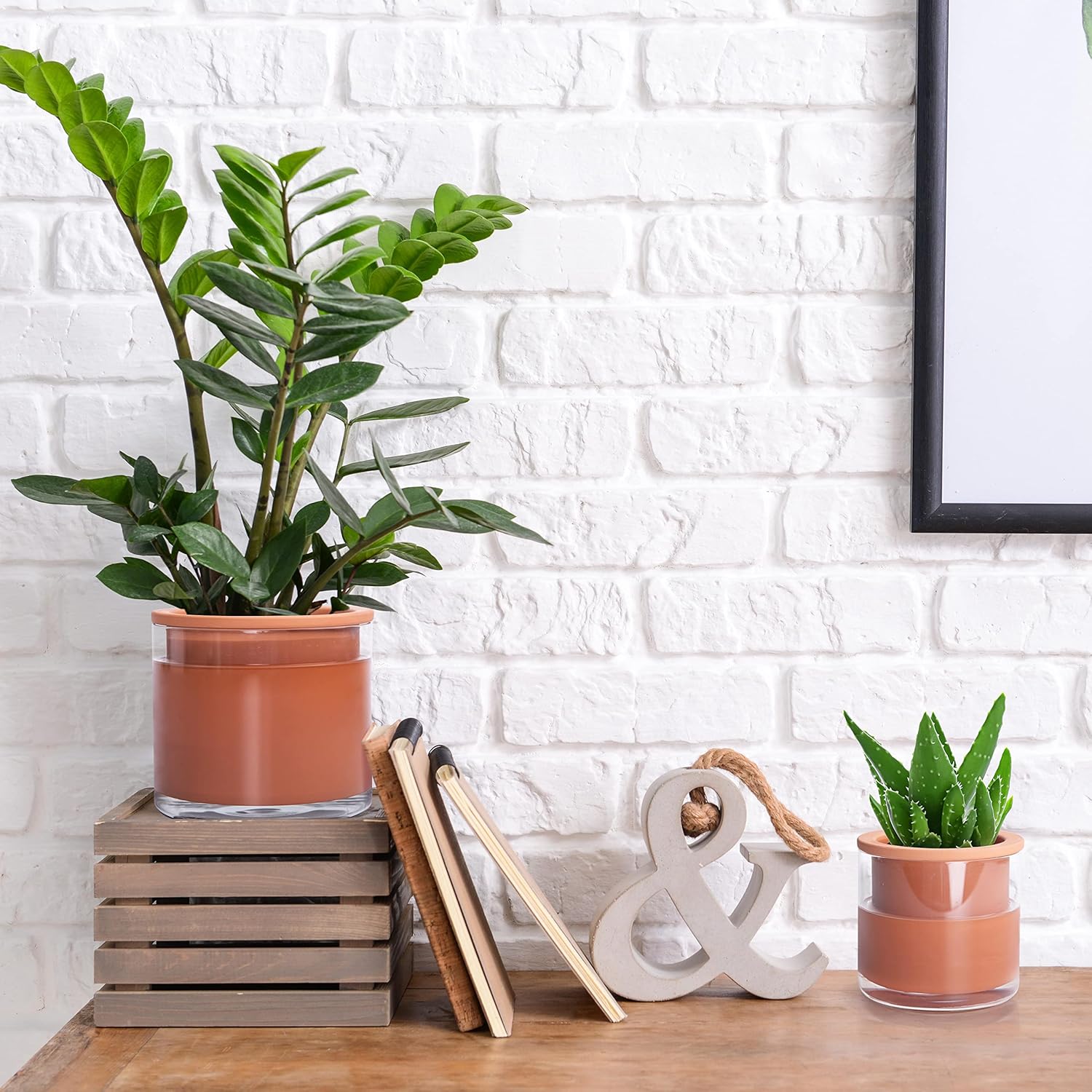 - Terracotta + Glass: Elegant modern design self watering plants pot with ingenious natural breathable terra cotta material and clear glass container. See the water surplus just from a glance.