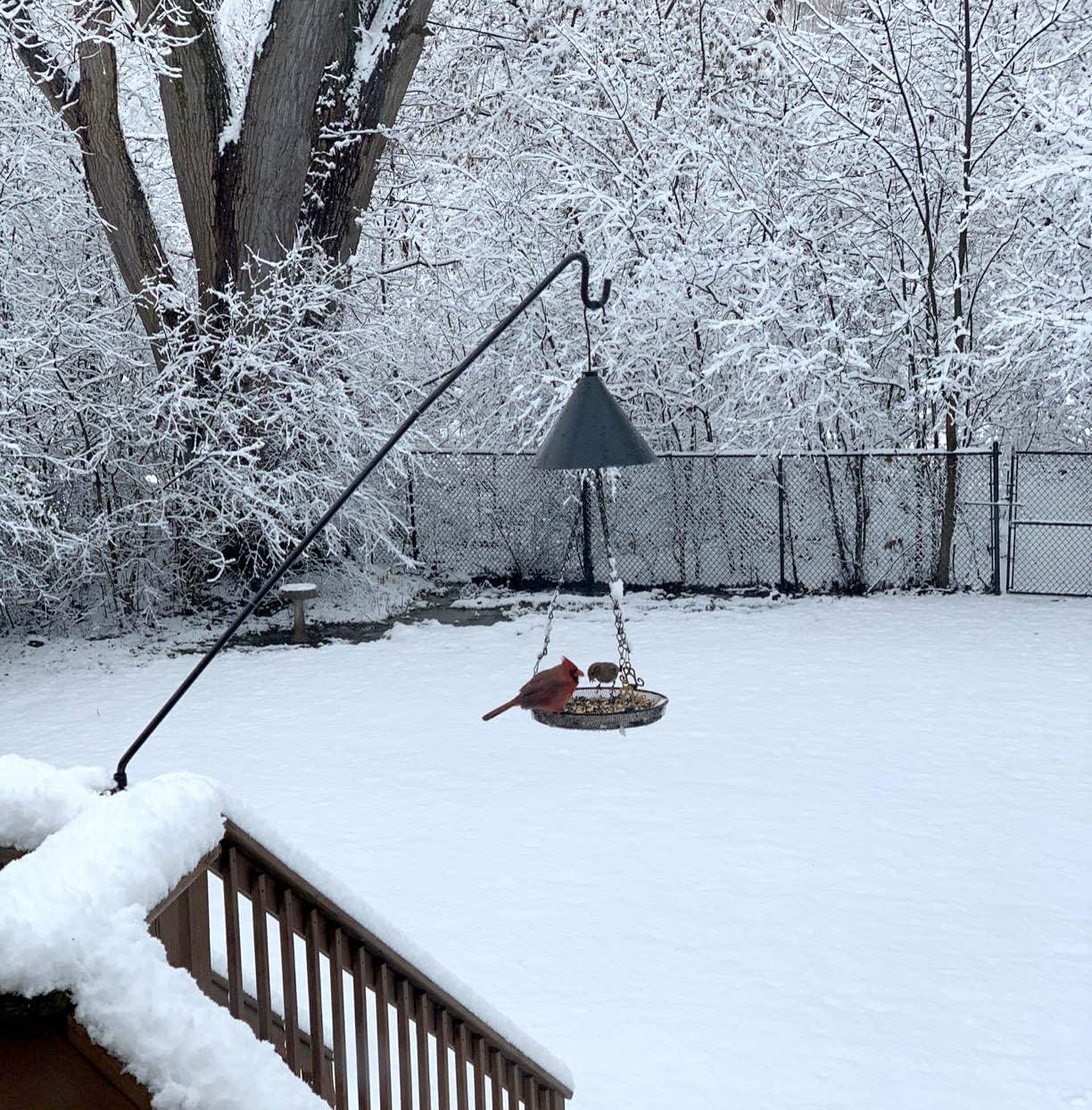 - Deck Hook Smart Design:43-inch bird feeder pole, a longer distance guard against squirrels. Things like bird droppings and seeds all fall off the deck, making it easier for you to clean up.2 Packs
