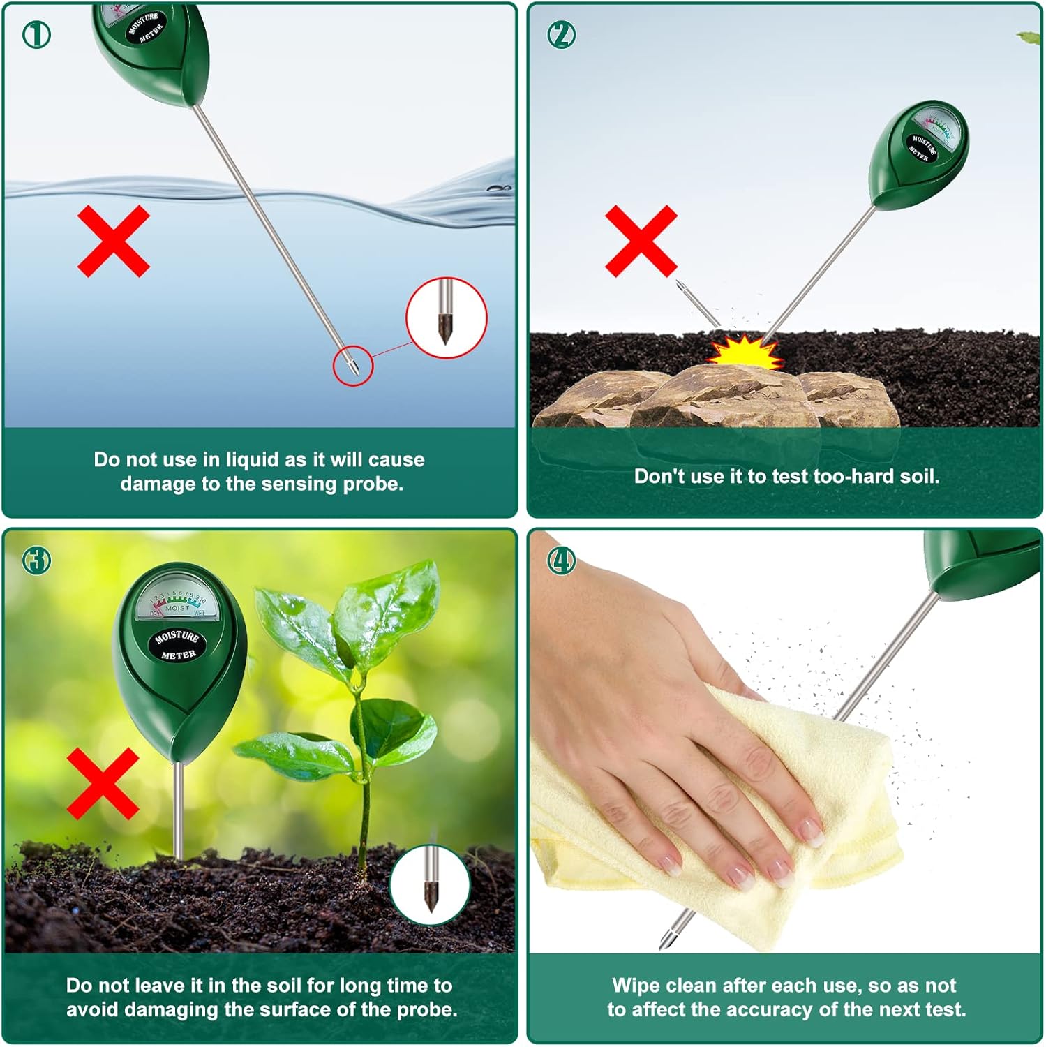 - IMPORTANT TIPS:1.Do not use in liquid as it will cause damage to the sensing probe. 2. Don't use it to test too-hard soil. 3. Wipe clean after each use, so as not to affect the accuracy of the next test.